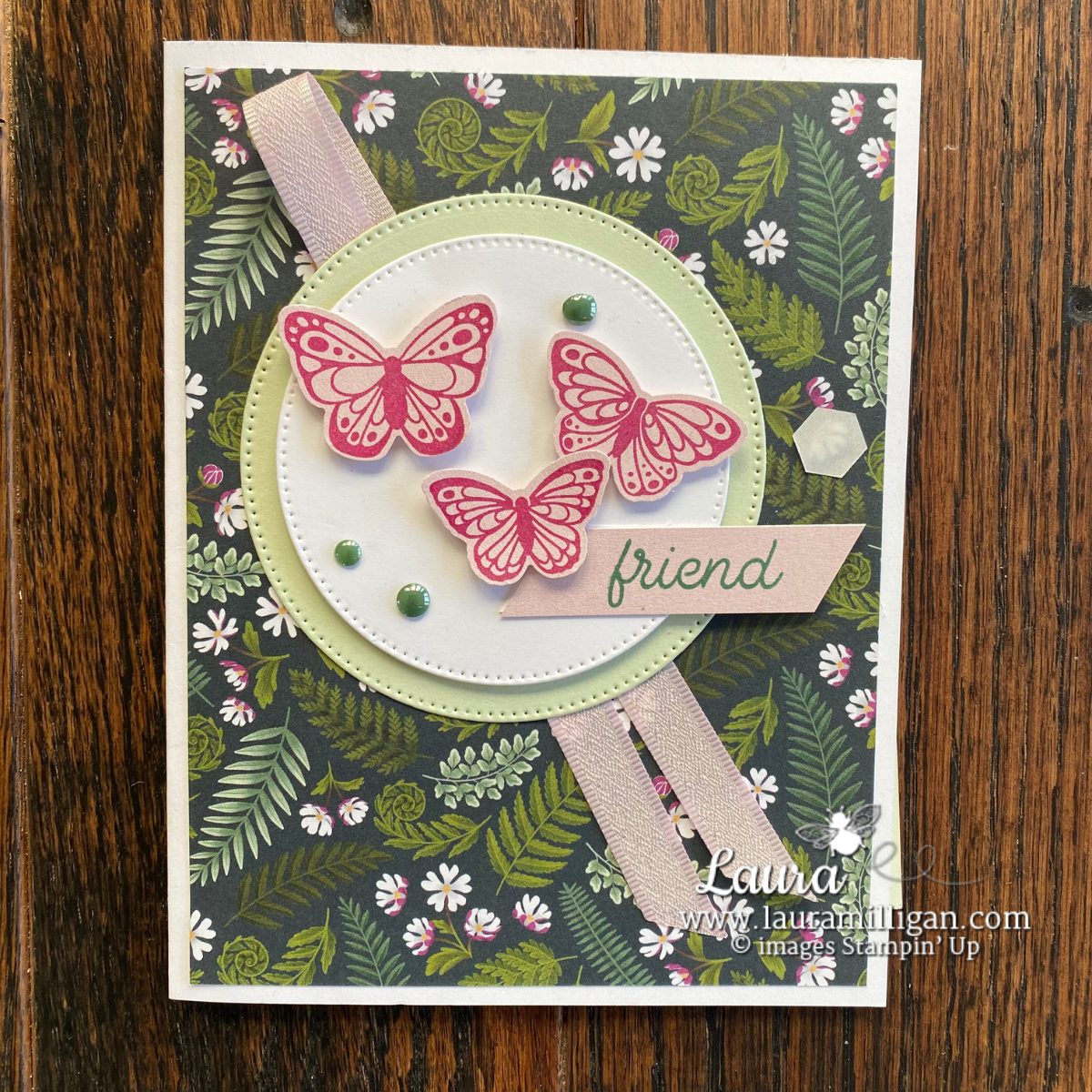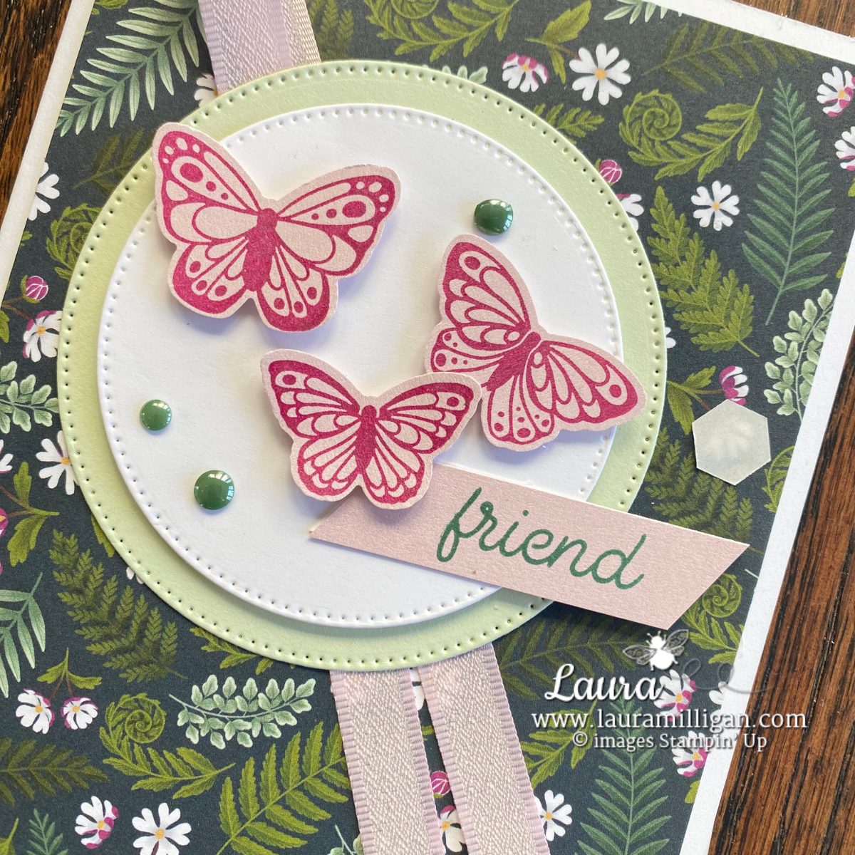 Now this one is bringing the energy! The rich Flora Designer Series Paper creates a dramatic backdrop, and those layered butterflies practically dance right off the card. Adding them over the circular focal point really helps them stand out—it’s like giving them their own little stage.