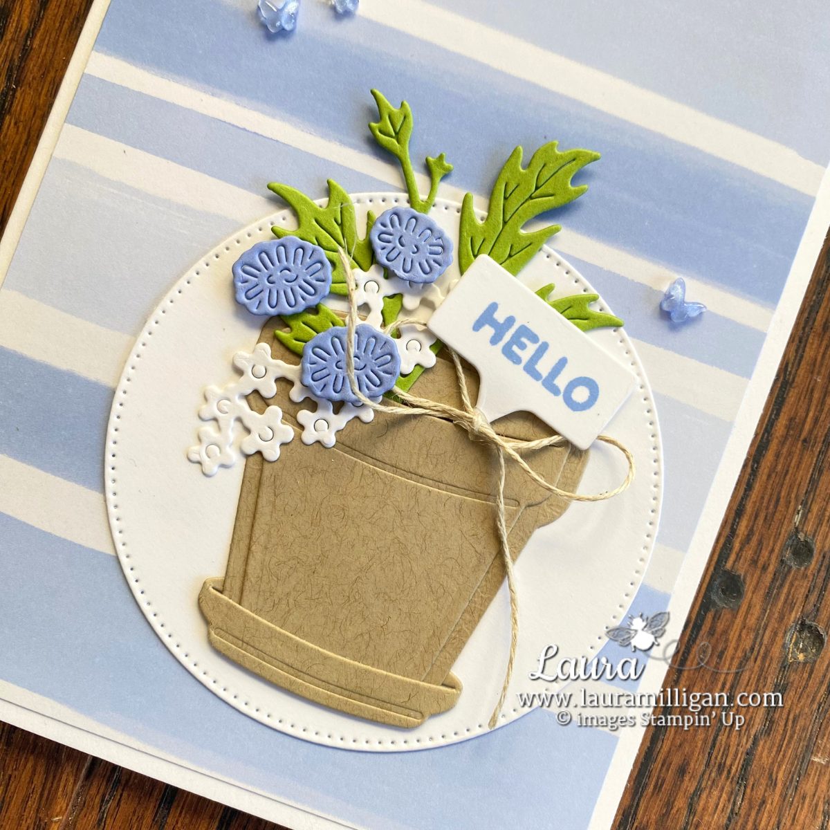 This card has such a gentle, welcoming feel—like a breath of spring. The soft striped background sets the stage, while that adorable flower pot steals the show. I love how the layered blooms add just enough dimension without feeling fussy.