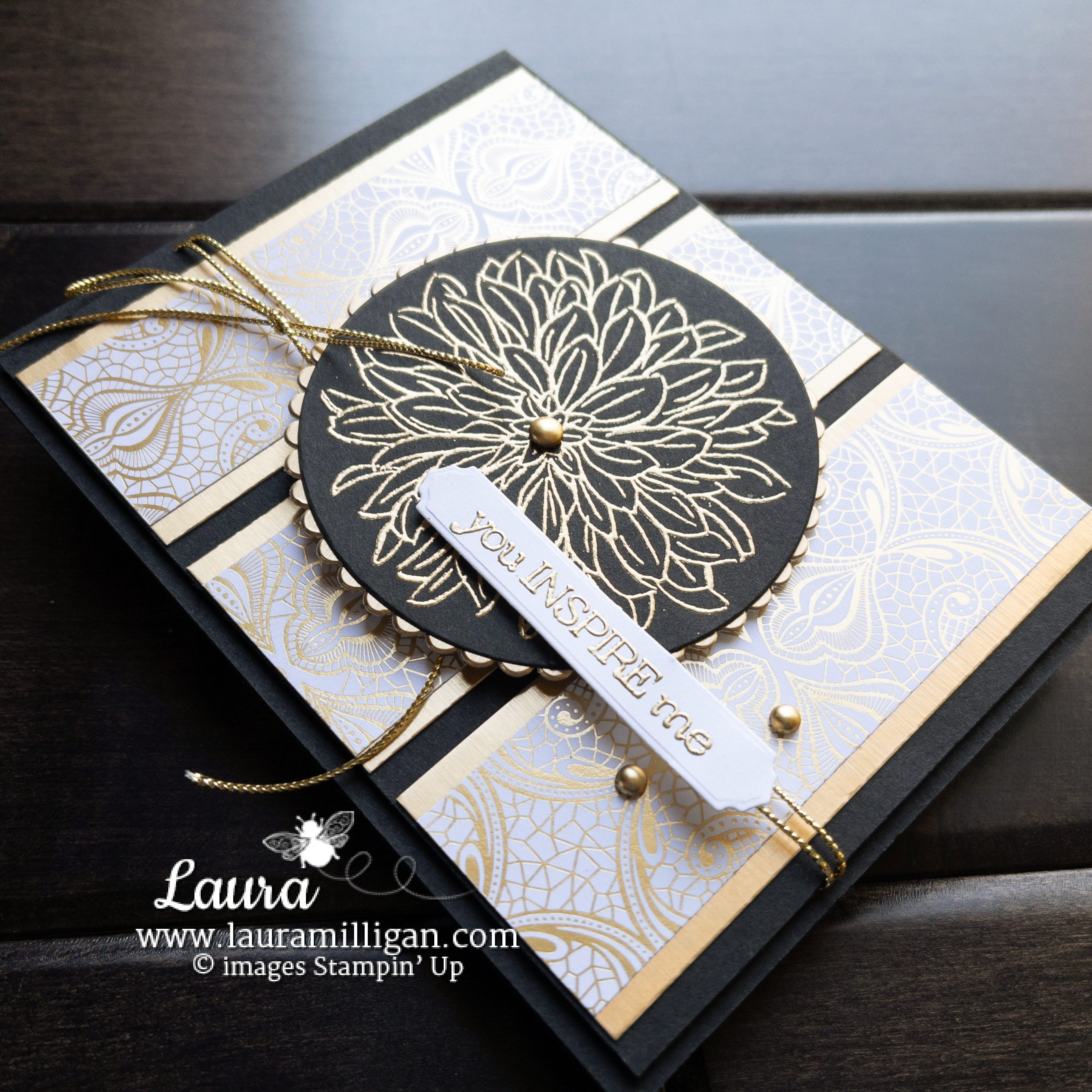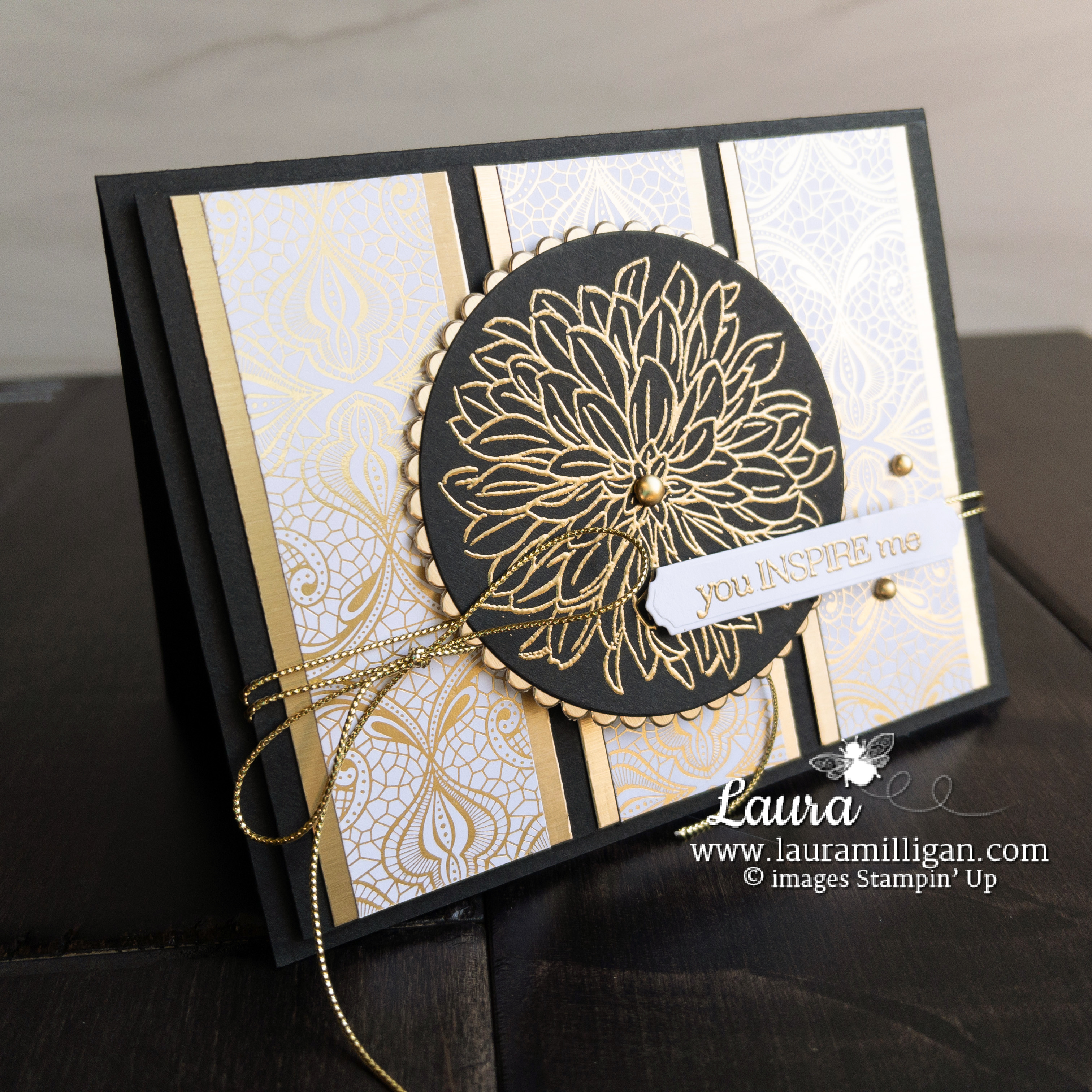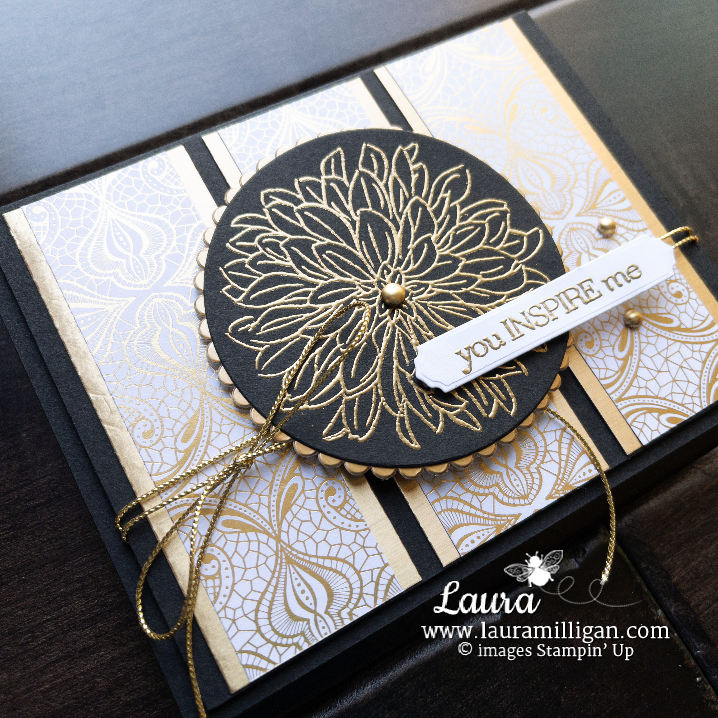 Today I am sharing a beautiful black and brushed gold card creation using the Delicate Dahlias Stamp Set that can be earned FREE with a qualifying purchase from my Stampin’ Up! Online Store. (Ends September 30!)