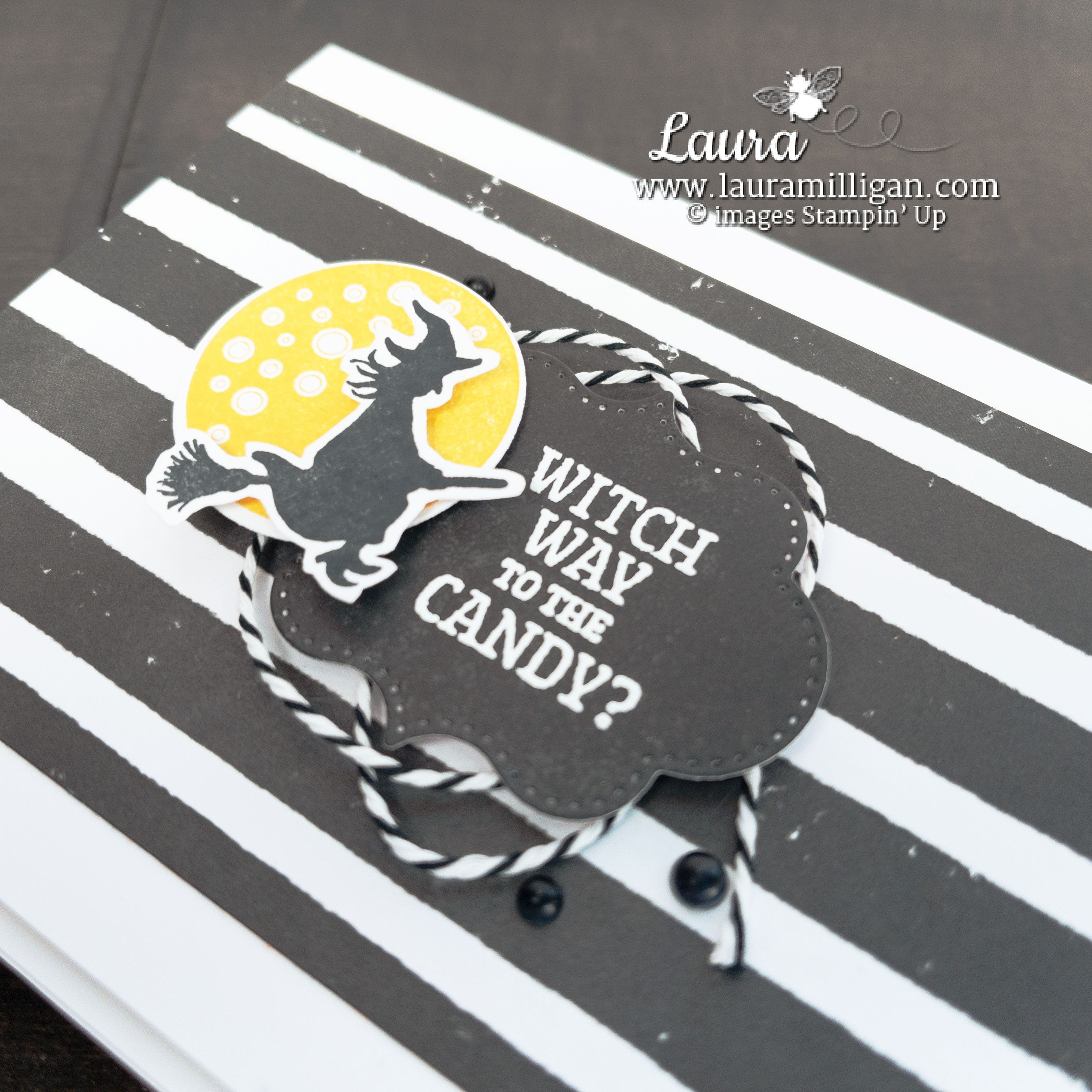 - Snip the witch closely with Paper Snips. Crop the moon with the coordinating Frightful Tags Die and a Stampin’ Cut & Emboss Machine.