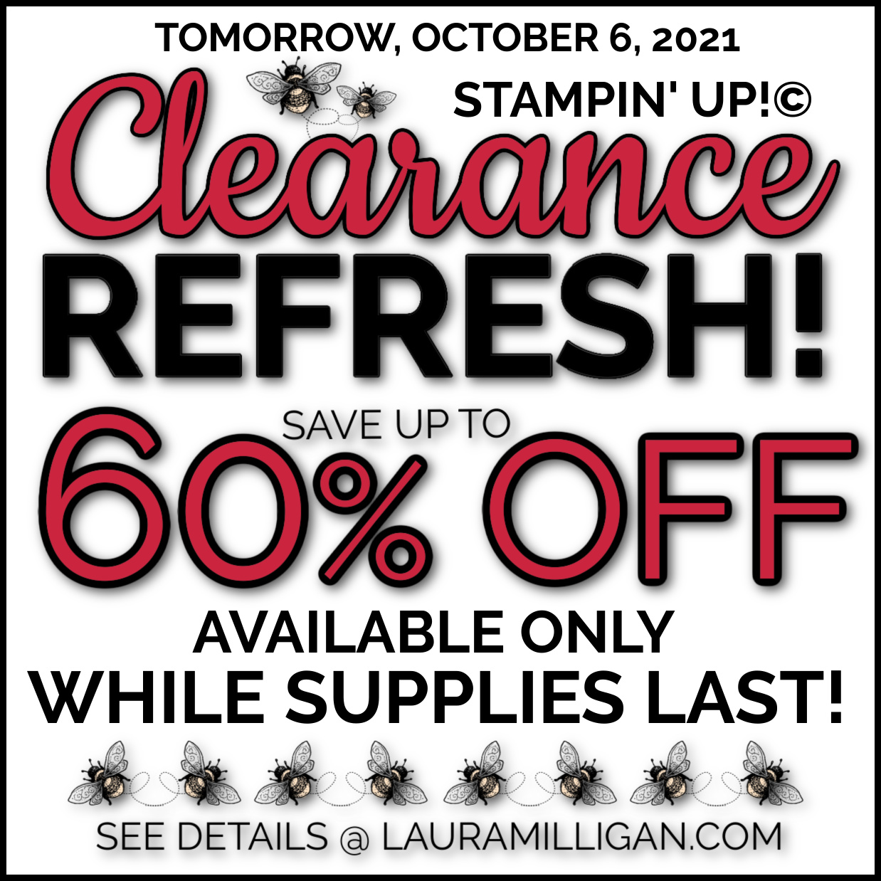 Tomorrow Stampin’ Up! will have a clearance rack update! Huge savings of up-to 60% off! Items are while supplies last and some products will sell out quickly – so shop early for best selection!