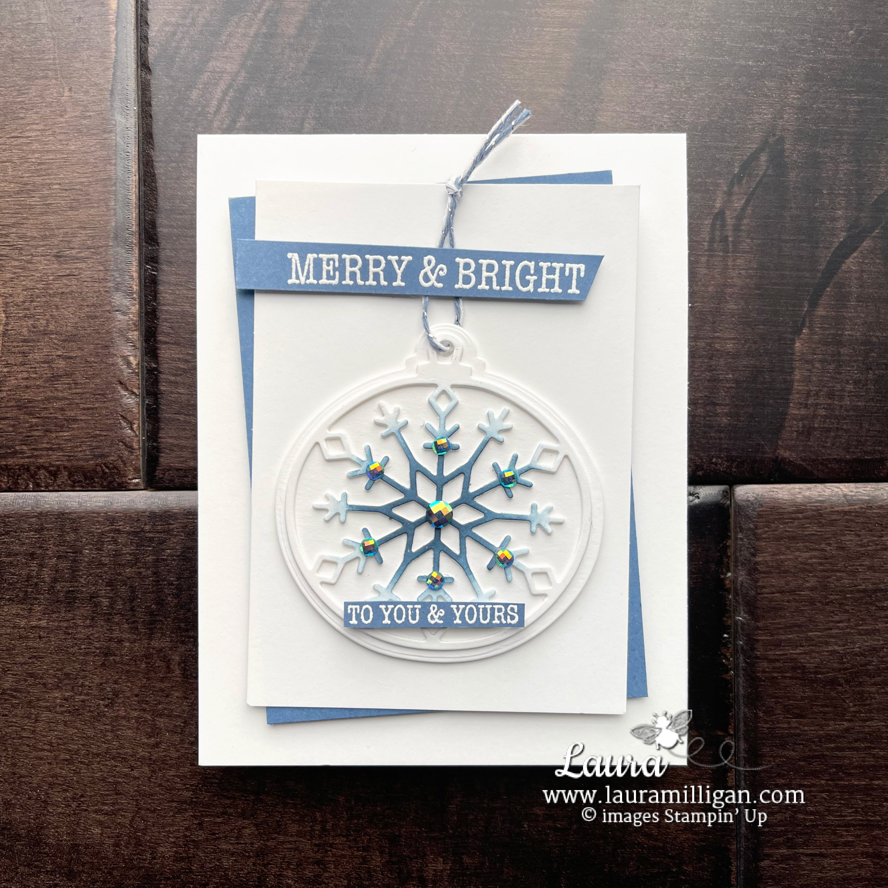 - Use the Delicate Baubles Dies and a Stampin’ Cut & Emboss Machine (Mini or Standard) to crop three detailed snowflake baubles and one solid bauble in Basic White.