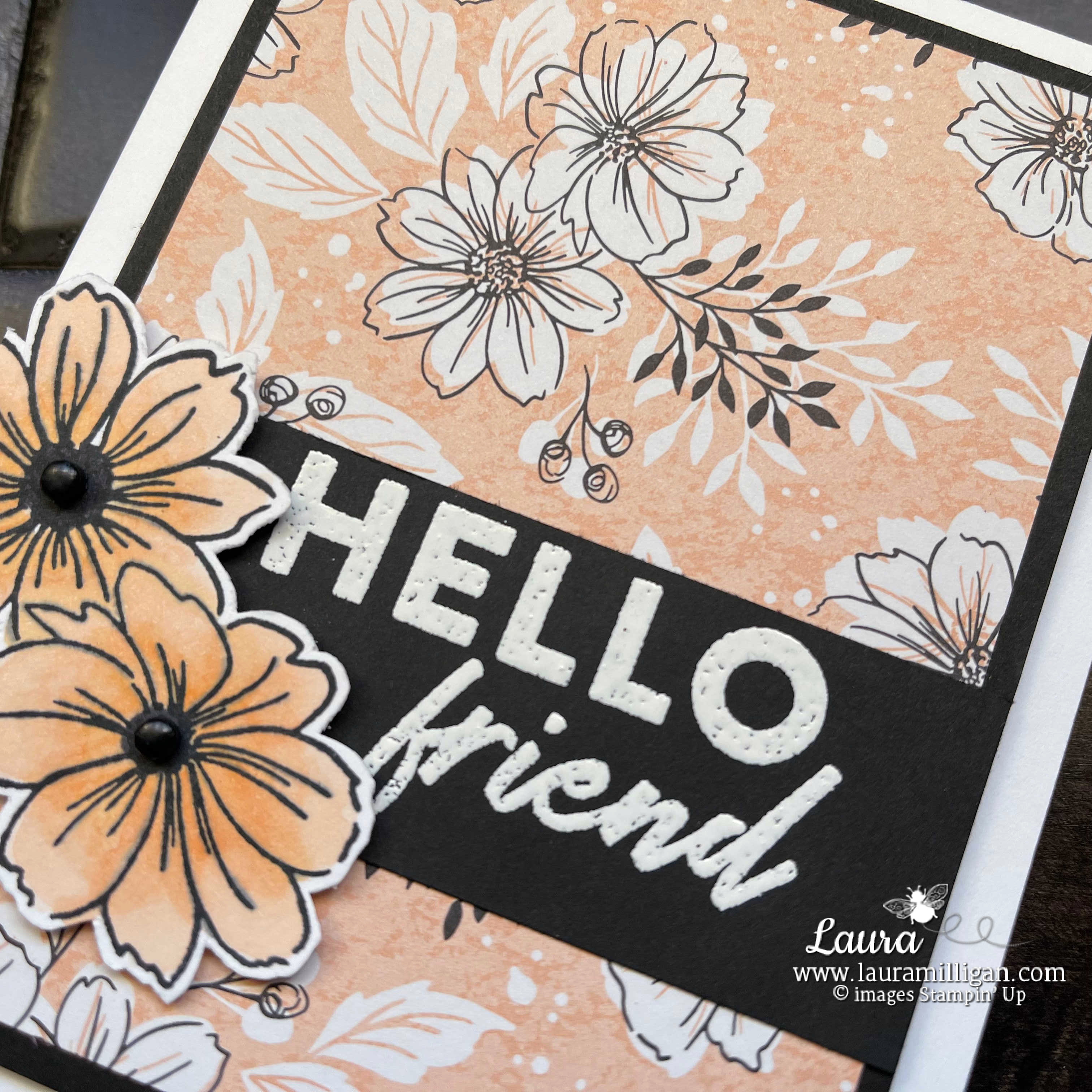 - Adhere the DSP to the Basic Black Cardstock with Multipurpose Liquid Glue and to the card base with Dimensionals.