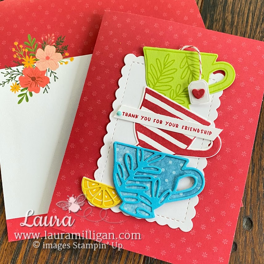 My card features lots of new products – and some of our new In Colors- everyone seems to be loving them! They are so bright and cheerful. I stamped and die cut three different tea cups and stacked them on a Basic White panel – cropped from the Scallop Contour dies. I love the added touch of the lemon and the little tea bag string with the heart tag at the end!