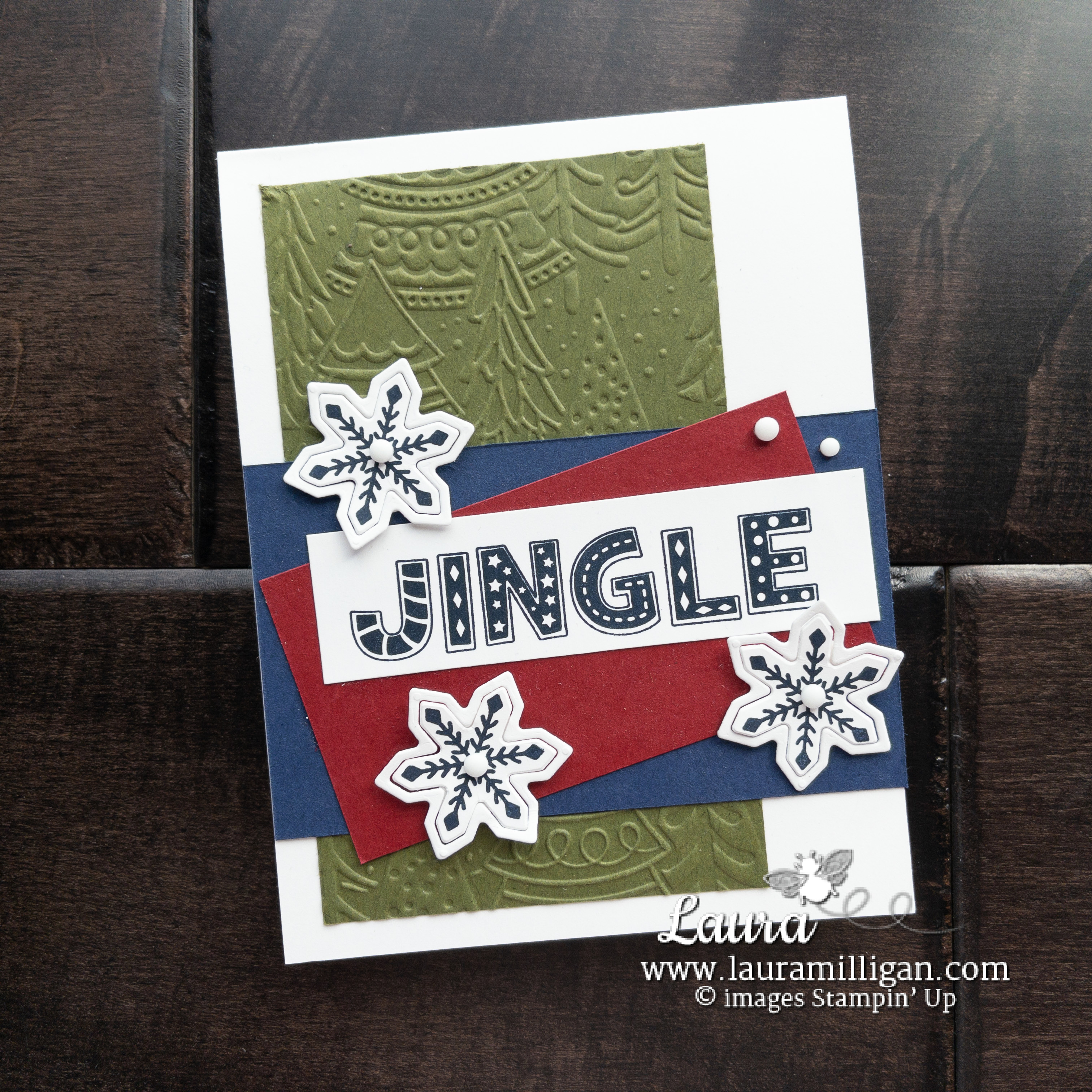 - Stamp three snowflakes (Spruced Up) in Night of Navy Classic Ink spaced apart onto the Basic White layer.