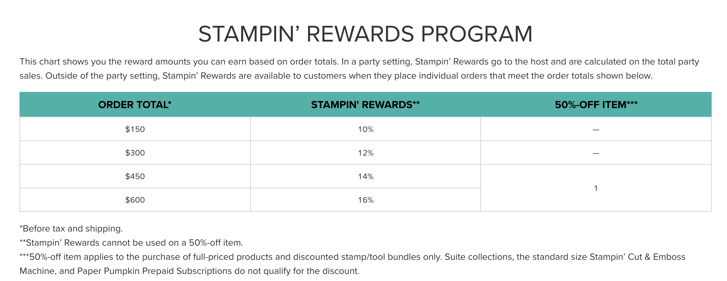 - EARN STAMPIN’ REWARDS $150+ ORDER – If your order is $150 or more, you will earn $15+ in host rewards in addition to every things else! Win, Win, Win!