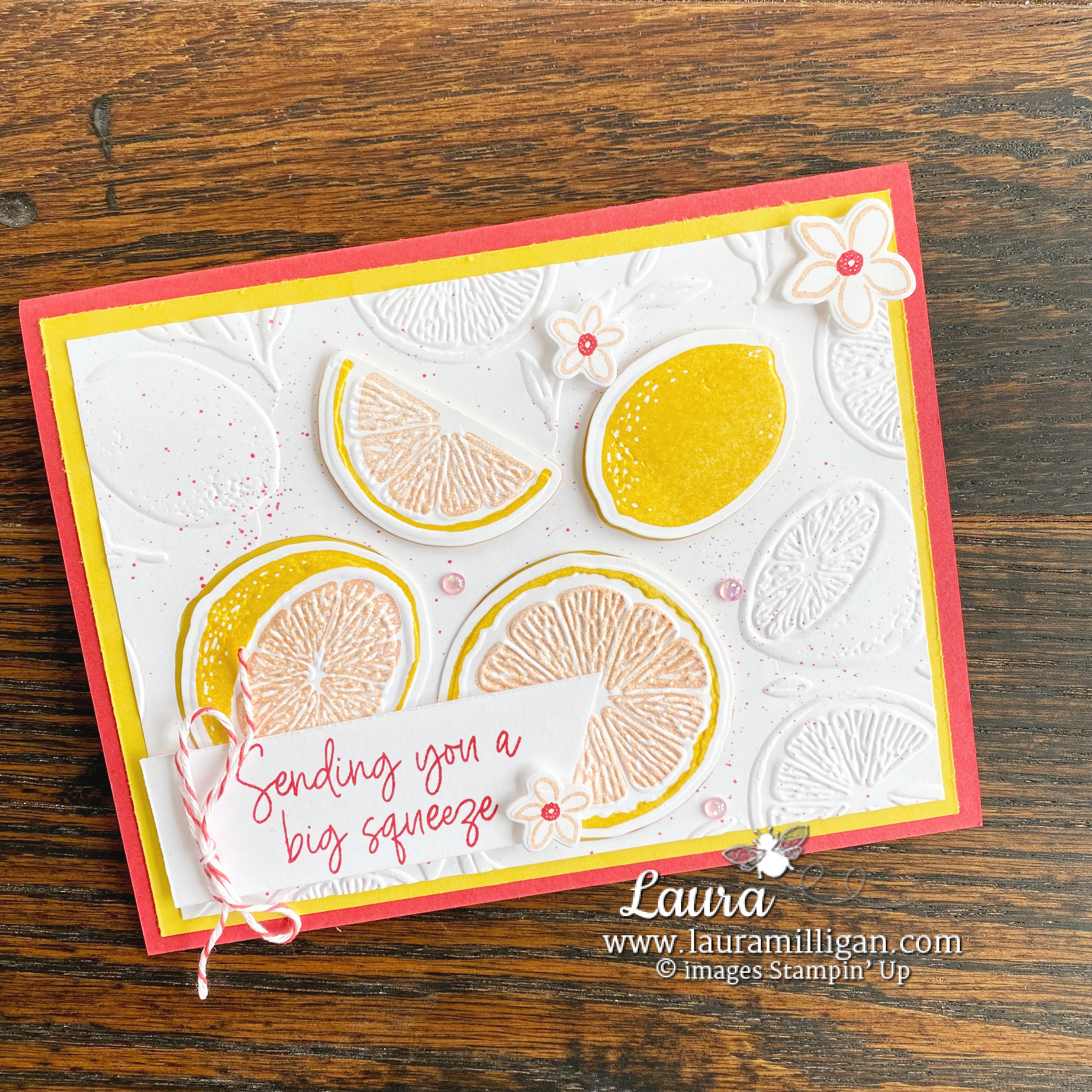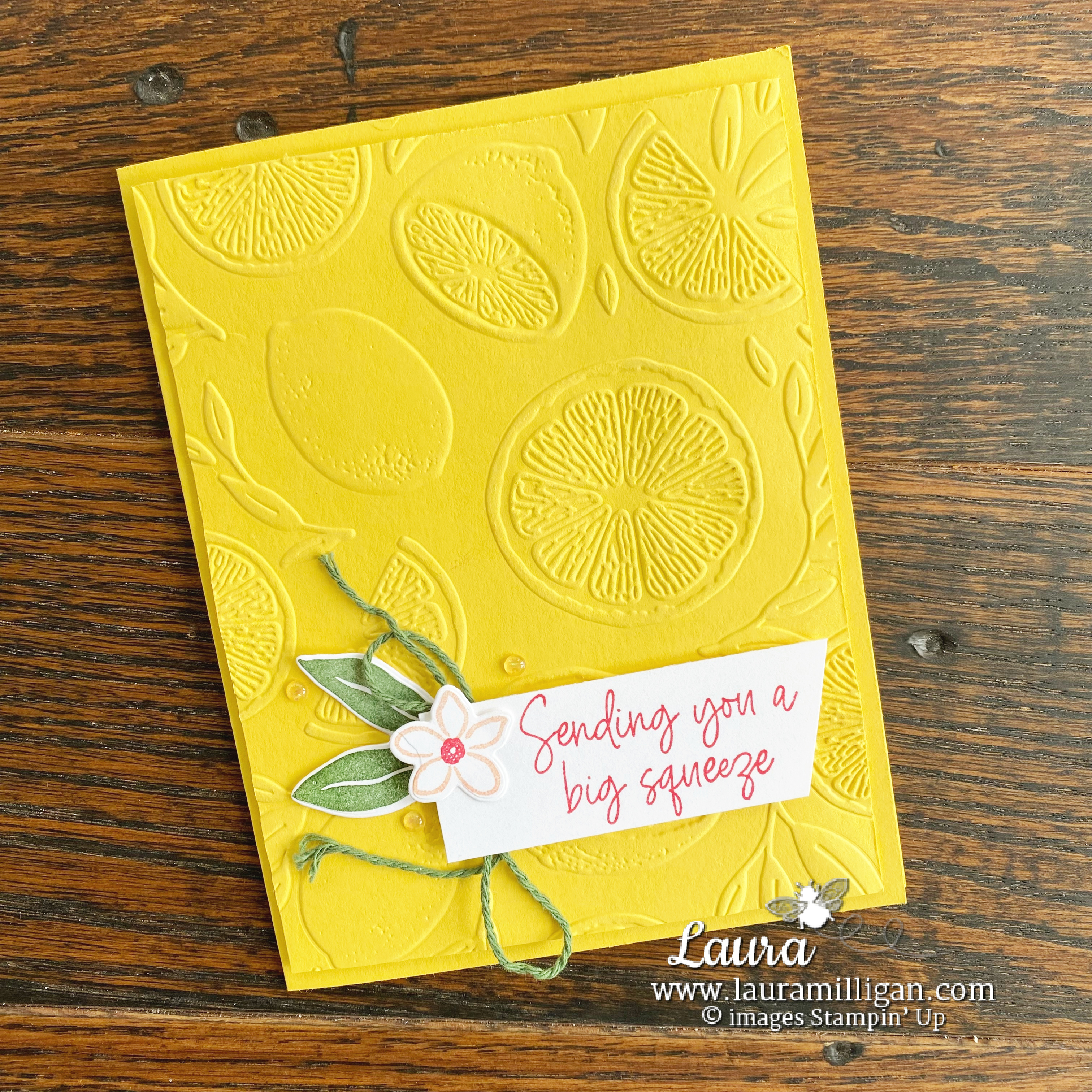 My second card uses the Hybrid Embossing folder and is really cool – you actually put the die into the embossing folder – and not only does it emboss, but it also die cuts the four lemon shapes. Again, please watch the replay of the FB Live because I explain exactly how to use it!!! I love the detail of the embossing folder, and with the added hybrid die cut, it makes for a really cute card – and one that is really fun to make!