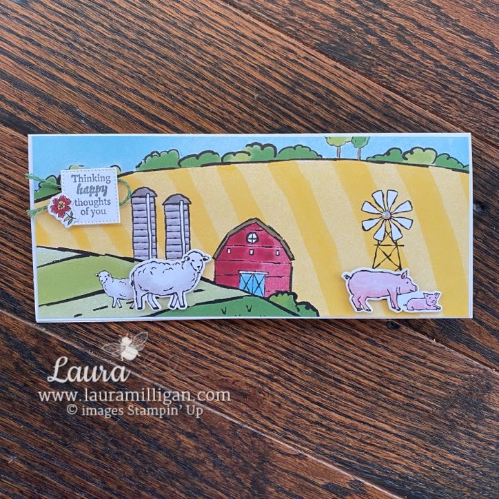 Next, I made a slimline card – doesn’t this just make you smile? The focal point of this card – the farm scenery was cropped from one of the 12 X 12 pieces of DSP. The sheep and pigs were also cropped from the DSP. That made this card go together so quickly.