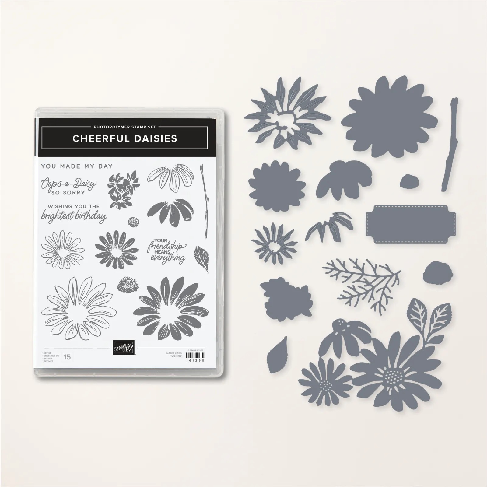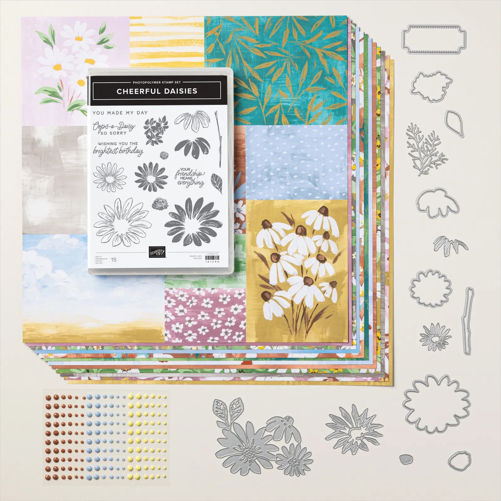 - Crop the sentiment and images with the coordinating Cheerful Daisy dies and a Stampin’ Cut & Emboss Machine. Adhere with Dimensionals.