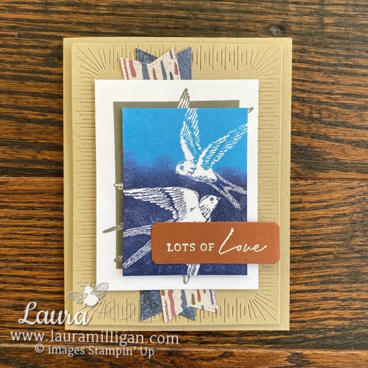 For the first card, I used sponge daubers to add color to the large bird stamp – Azure Afternoon at the top and then Night of Navy on the bottom. You could really use any color combinations with this technique! So fun! This panel was trimmed and off set above the bird image stamped onto a panel of Basic White with Pebbled Path ink. I love the added texture/detail of the Radiating Stitches dies on the Crumb Cake panel. If you have been waiting to order these dies – they are available again!