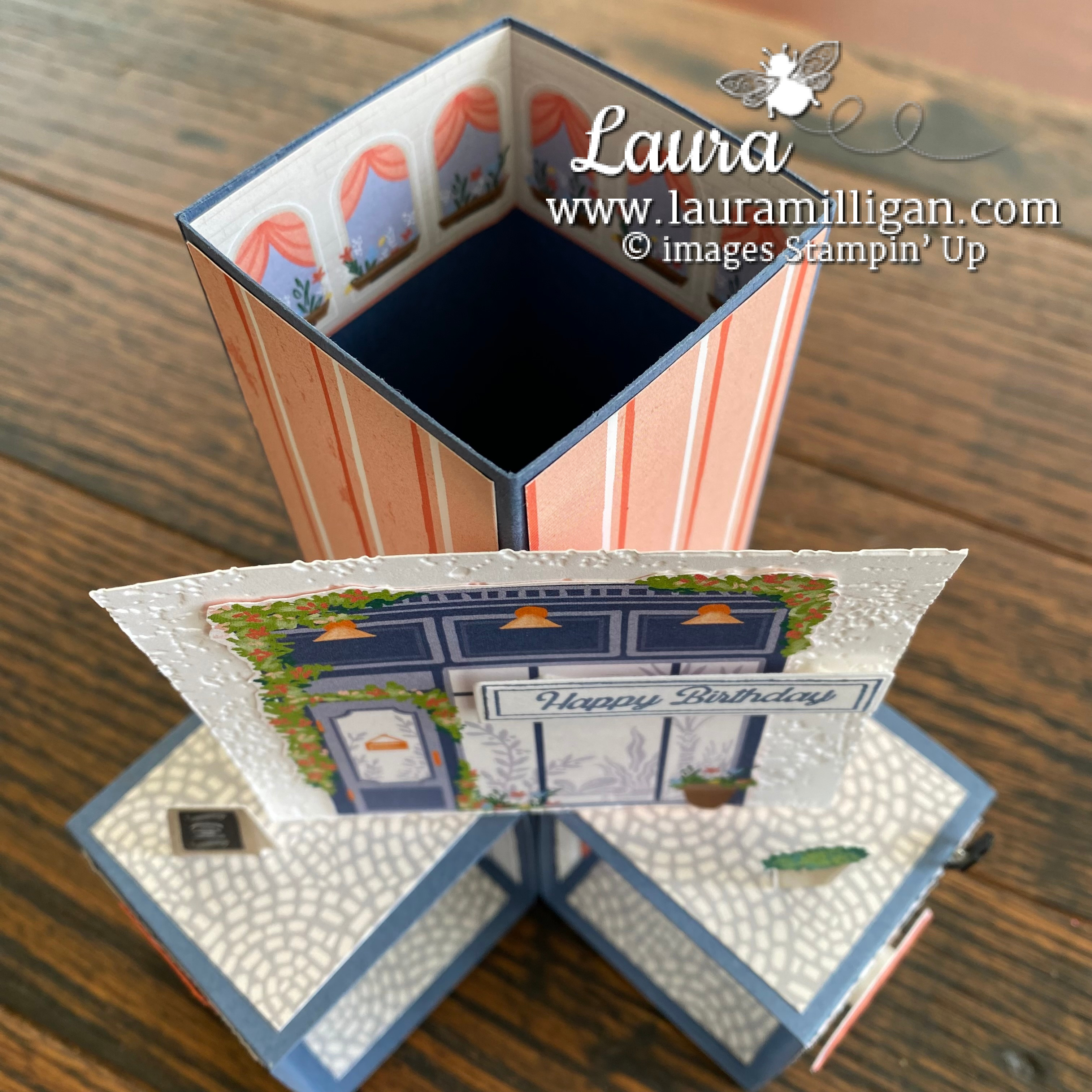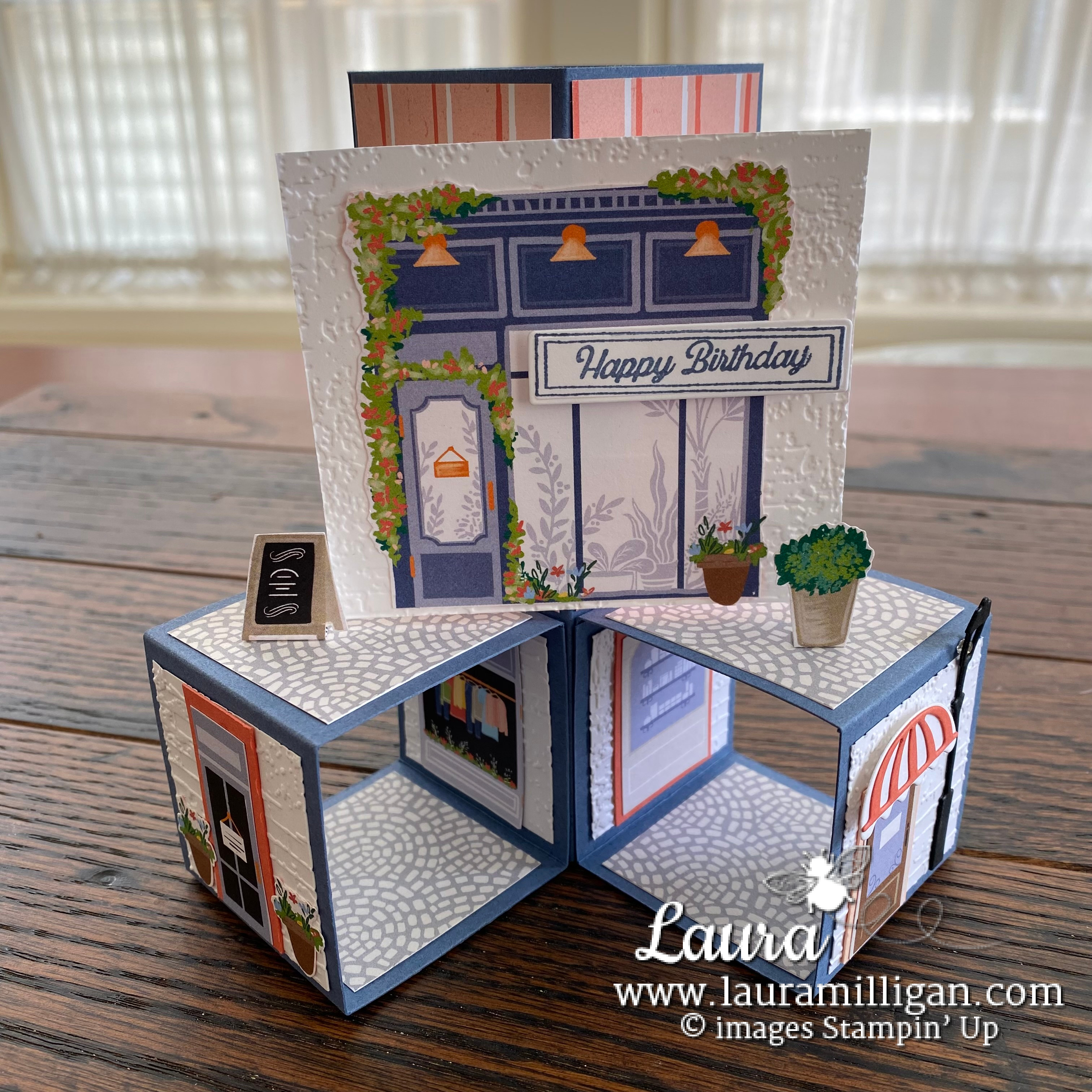 I had a friend and guest stamper, Rene’ share a really cool card she made for me on this week’s Facebook Live! It looks way more complicated than it is! The base of it is pretty quick to create. The extra details which make it so cute does take a bit more time – but what a WOW card -and worth the extra time I think! The card features the adorable Les Shoppes 12″ x 12″ Designer Series Paper. So cute – and seemed perfect for this card!