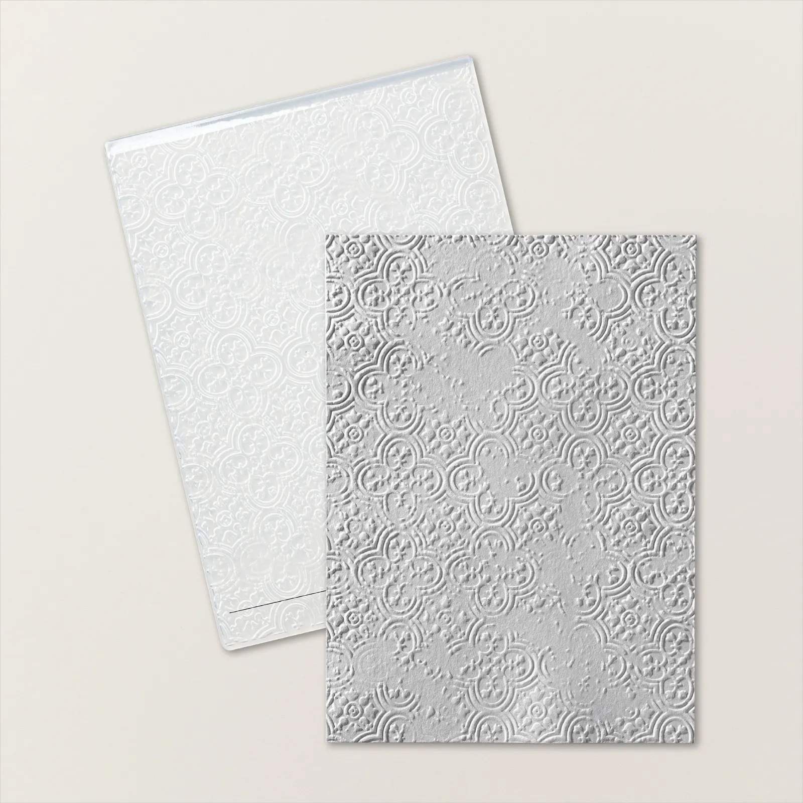 - Tuck the Very Vanilla layer inside the Distressed Tile 3D Embossing Folder and run through a die-cut machine.