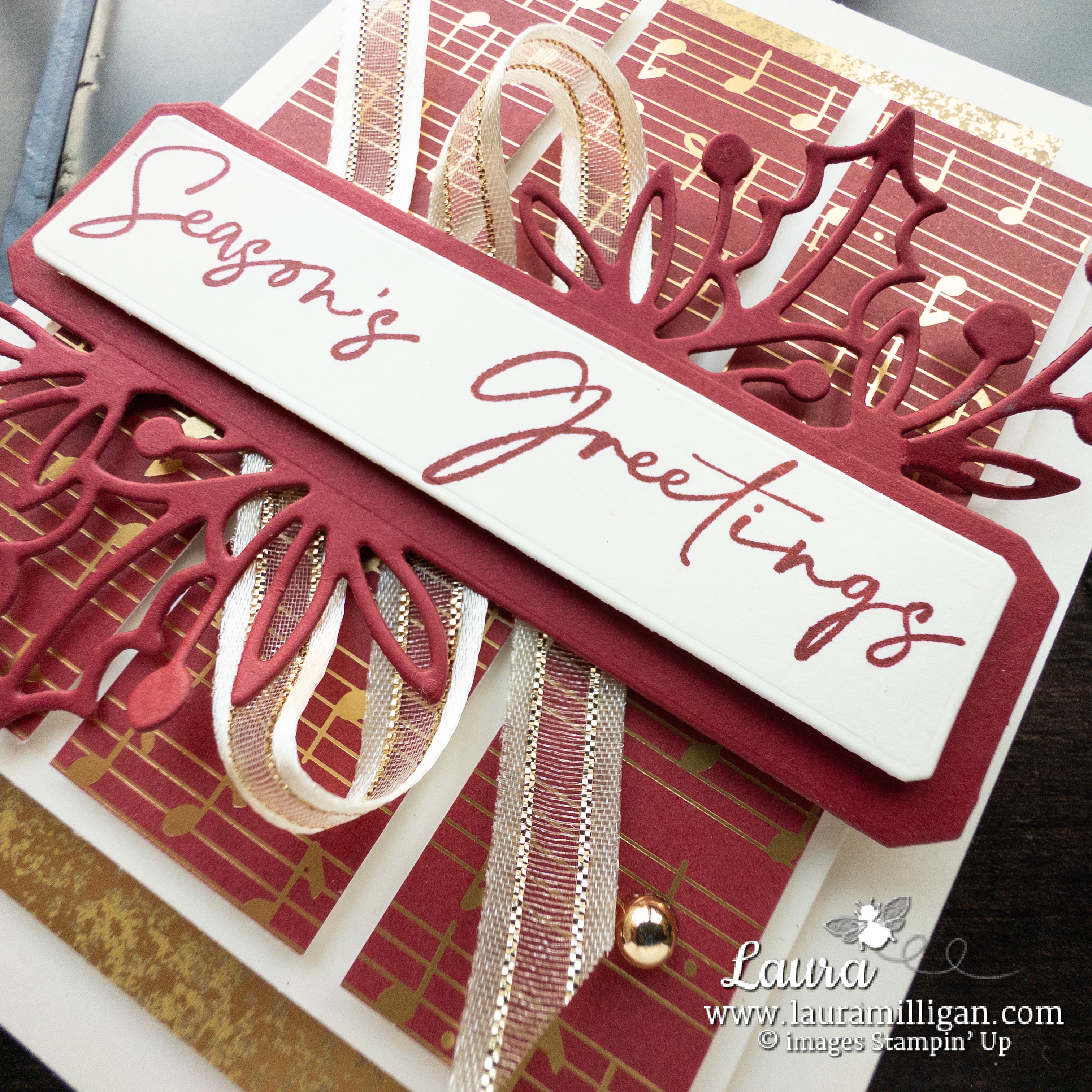 - Adhere to Gold & Vanilla 3/8″ Satin Edged Ribbon with Stampin’ Seal and to the card with Stampin’ Dimensionals.
