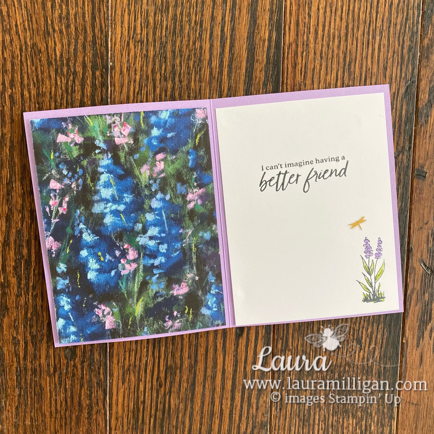 I finished up the card with a stamped greeting and flower on the inside – and one of the new dragonfly embellishments that are included in this new suite.