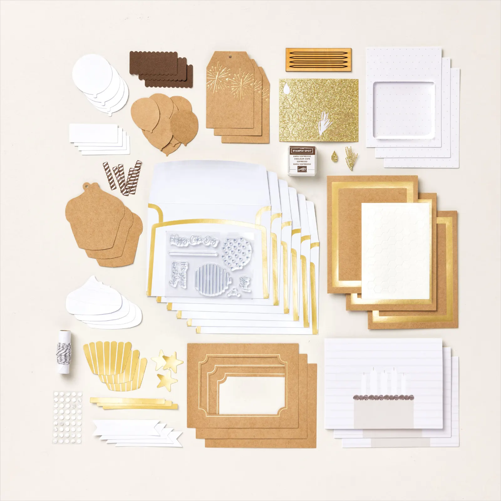 *A 9-7/8″ x 6-1/2″ x 2-3/4″ (25.1 x 16.5 x 7 cm) printed designer box for storage or crafting on the goProduct colors: Basic White, Crumb Cake, Early Espresso, gold glitter