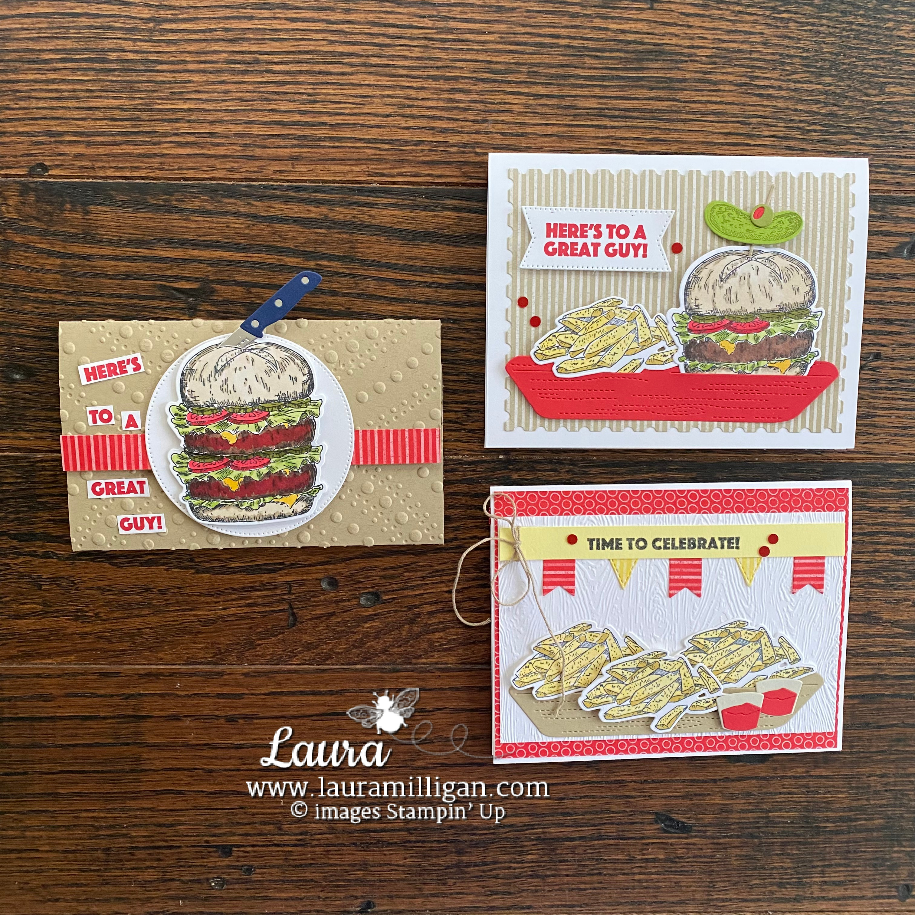 Monday on my FB Live, I shared the above three cards featuring the Bistro Burger Bundle (currently on sale). Hope you will take advantage of my ordering special to get the card kits for free – AND with a $50 order, you will get the dots as well!!! Win Win!