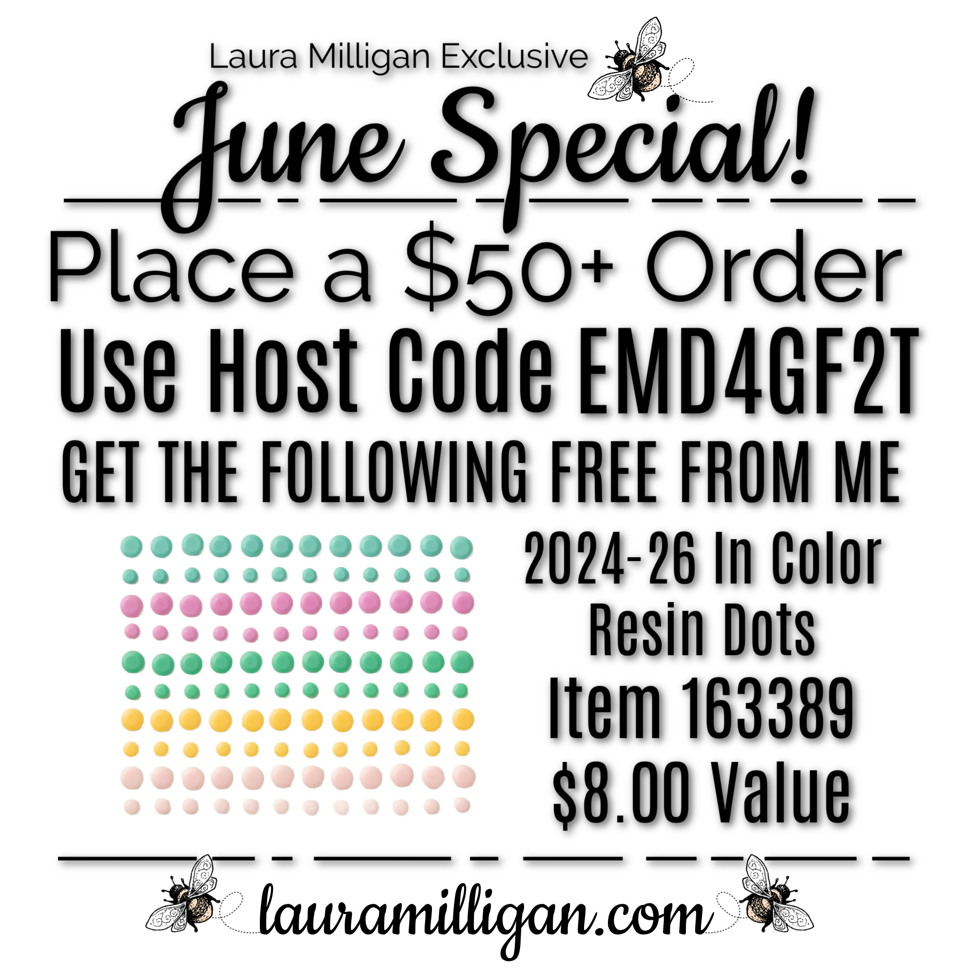 GET THE CARD KITS ABOVE FREE! Place an order of $35+ with host code EMD4GF2T by this Friday, June 21 and I will send you the pieces needed to make the cards above for FREE! Place an order of $50+ and you will get both the pieces for the cards and the 2024-26 In Color Resin Dots FREE (Limit One Resin Dot Per Customer)!