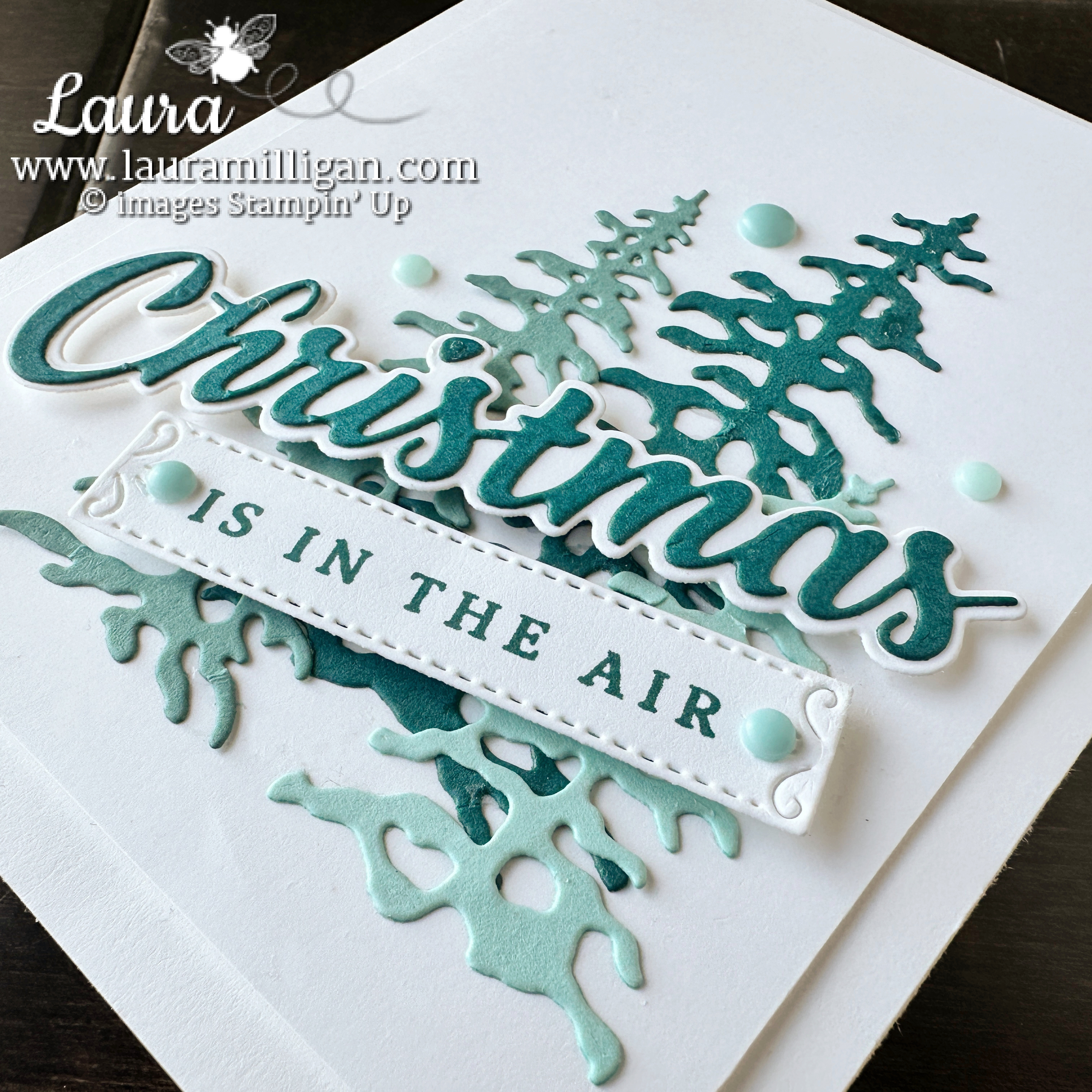 - Use a Stampin’ Cut & Emboss Machine (Standard or Mini) to crop the three trees, the stamped and die-cut sentiments.