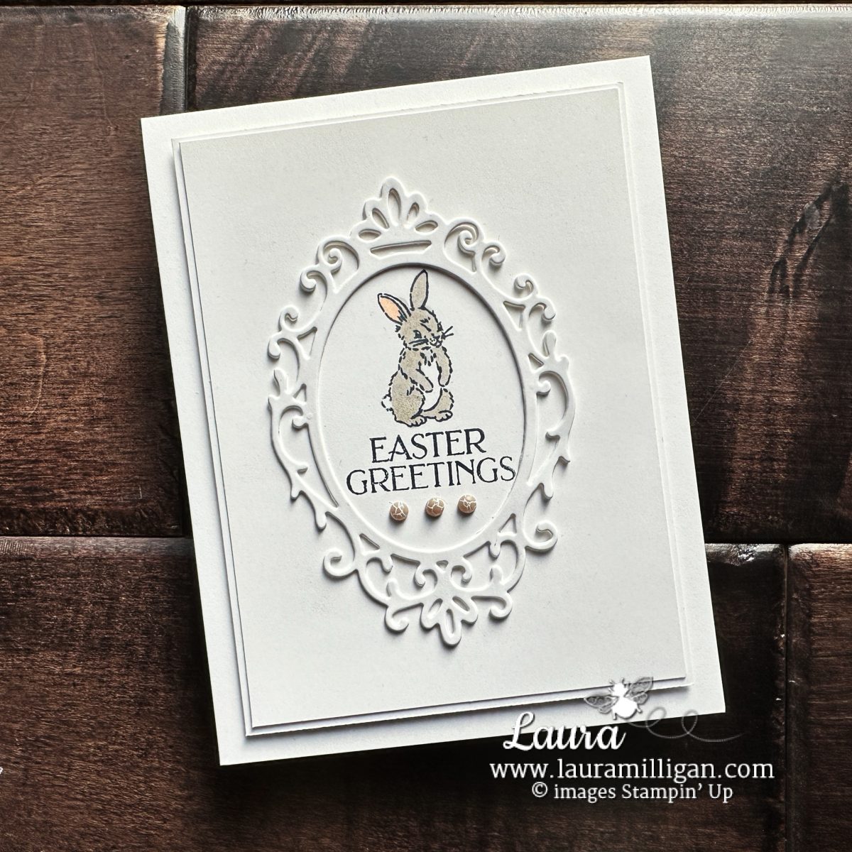 - Stamp the bunny and sentiment in Tuxedo Black Memento Ink onto the center as shown.