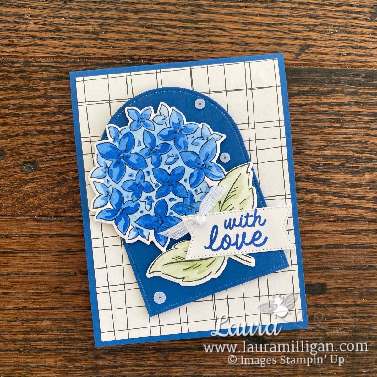 The first card I created used a bold color palette – featuring Blueberry Bushel. I used the coordinating masks to add color to the stamped image. I am lucky to have blue hydrangeas in my garden – oh they are just beautiful! That was the inspiration for the first card: