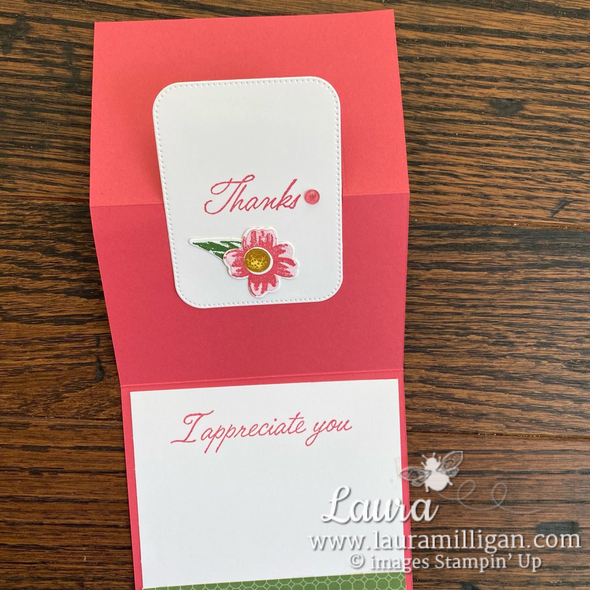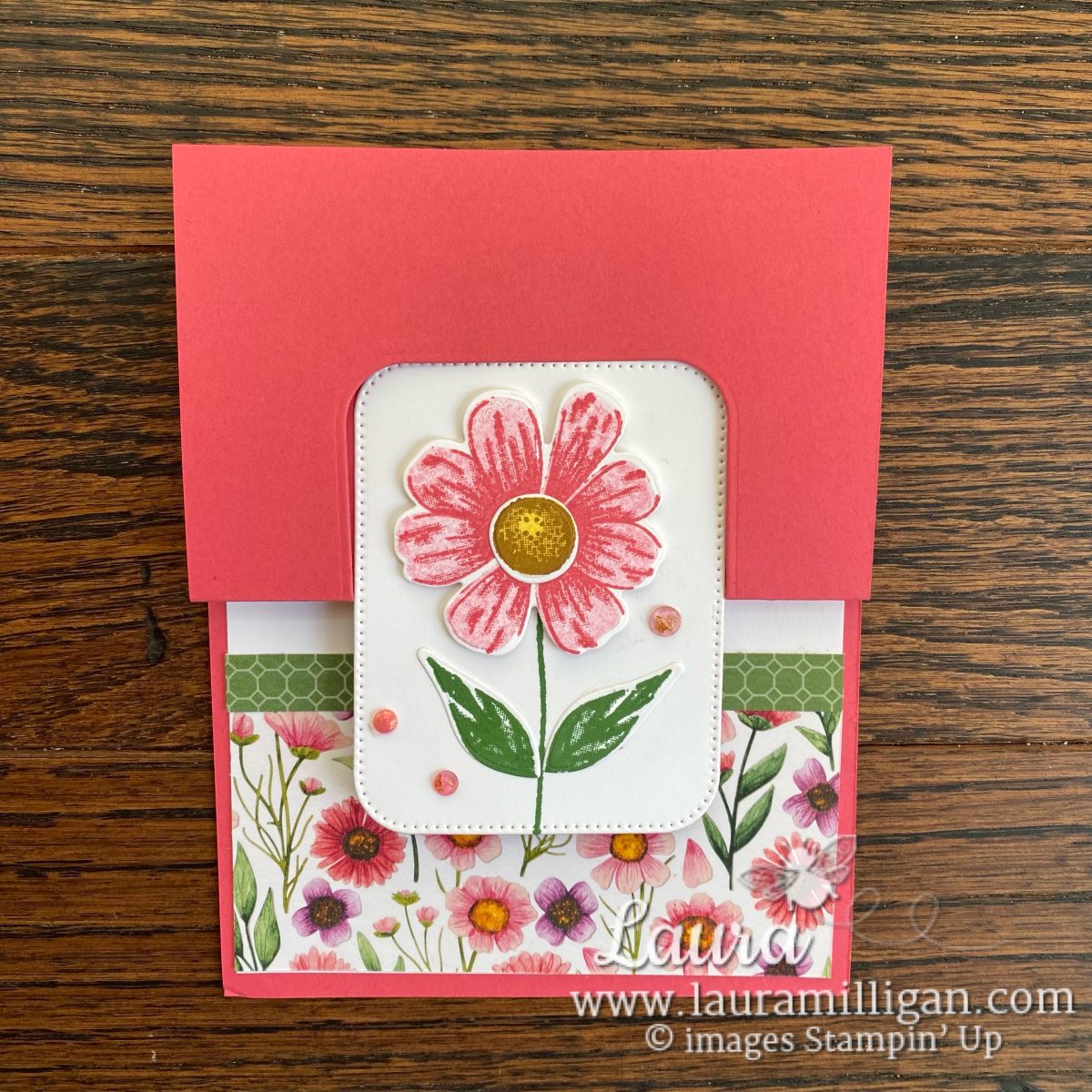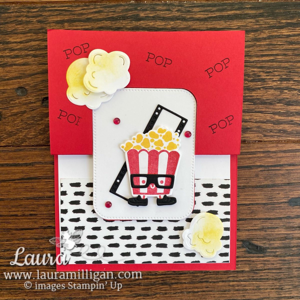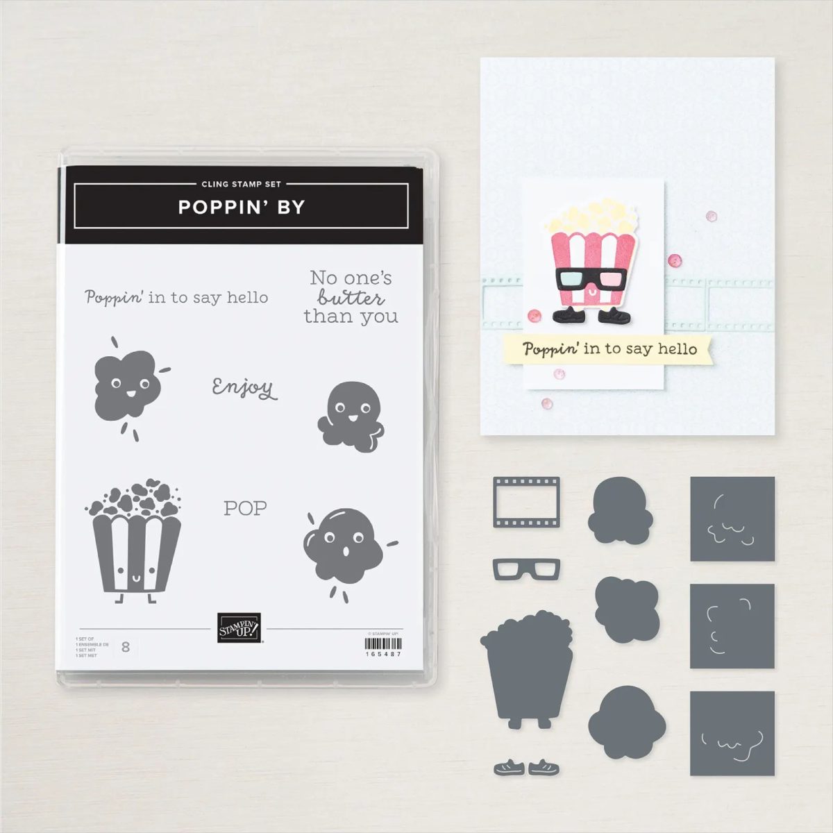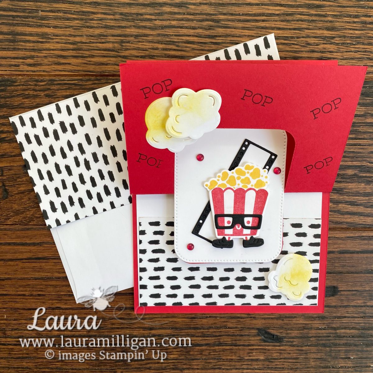 I couldn’t wait to share this playful fun fold card I created during my recent Facebook Live! Featuring the brand new Poppin’ By Bundle from Stampin’ Up!, this card is bursting with personality — just look at that cute little popcorn box with its glasses and happy smile! I paired it with bold black-and-white Designer Series Paper for a striking background, and stamped “POP” across the top flap for an extra fun touch. The unique fold makes this card as fun to open as it is to create!