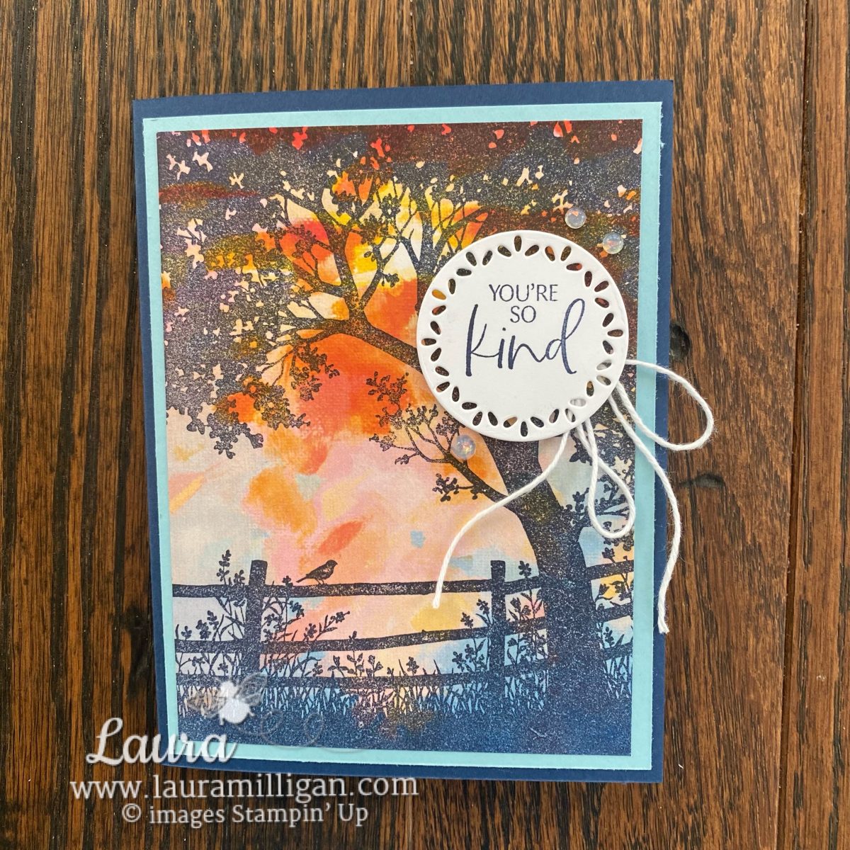 And my favorite — a bold, colorful sunset card! I used the Everyday Skies Designer Series Paper and stamped the tree image directly on it. This DSP is so gorgeous – and the pack contains so many striking sunsets to use along with the Peaceful View stamp set.