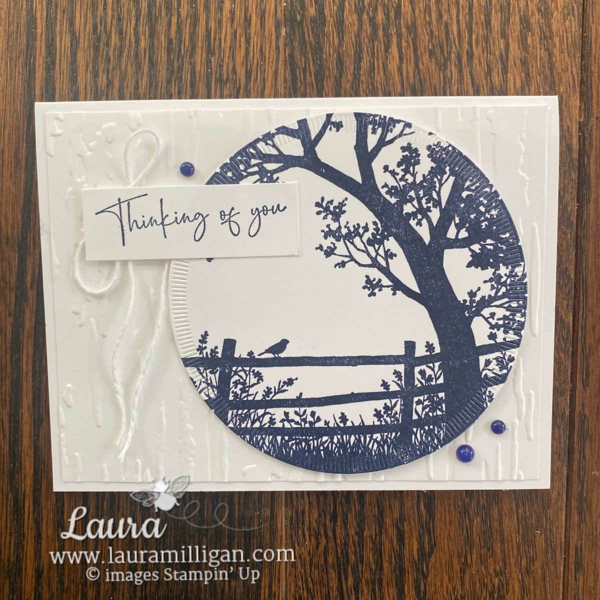 A simple monochromatic Thinking of You card — featuring a textured background and circle die cut. I added a little twine and some embellishments for a finishing touch!