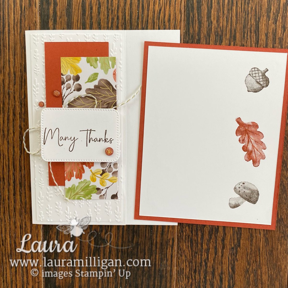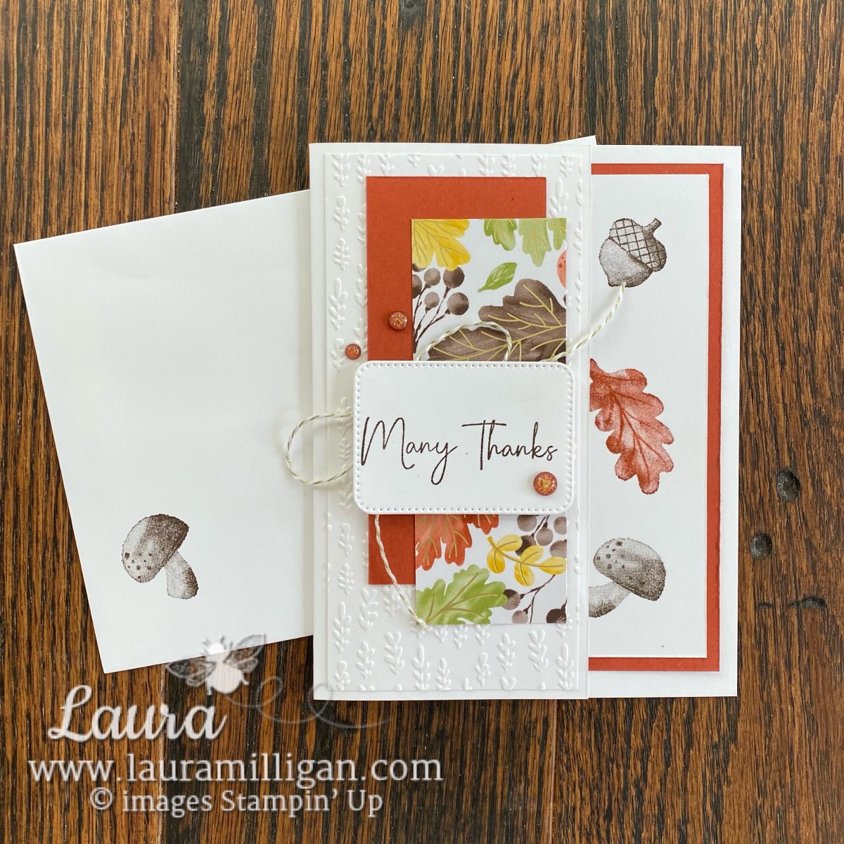 One of the things I love about this design is the pull-out panel tucked into the pocket. It’s perfect for writing a heartfelt note or adding extra stamped images—like the oak leaf, acorn, and mushroom shown here. The stamped elements tie back beautifully to the patterned paper and sentiment on the card front.