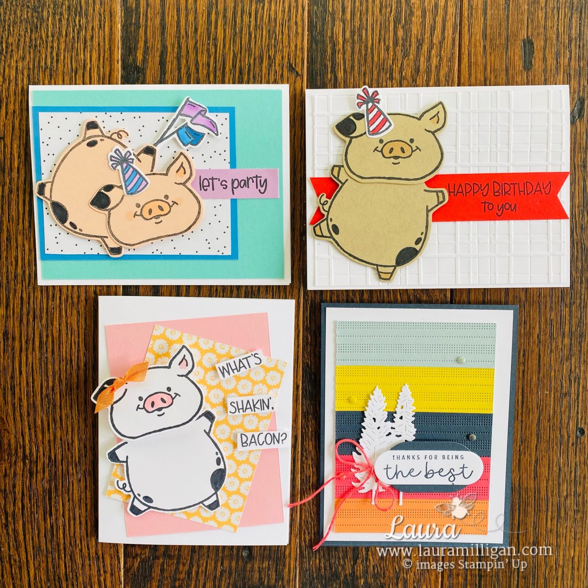 During my most recent Facebook Live, we had a blast creating these playful and colorful cards featuring the Party Piggy Bundle from Stampin’ Up! This bundle is full of charm and cheer—perfect for birthdays, celebrations, and bringing a smile to someone’s day. I showcased a variety of designs, from bold birthday greetings to punny sentiments like “What’s shakin’, bacon?” Each card highlights the bundle’s adorable pig images paired with fun colors, patterns, and textures.