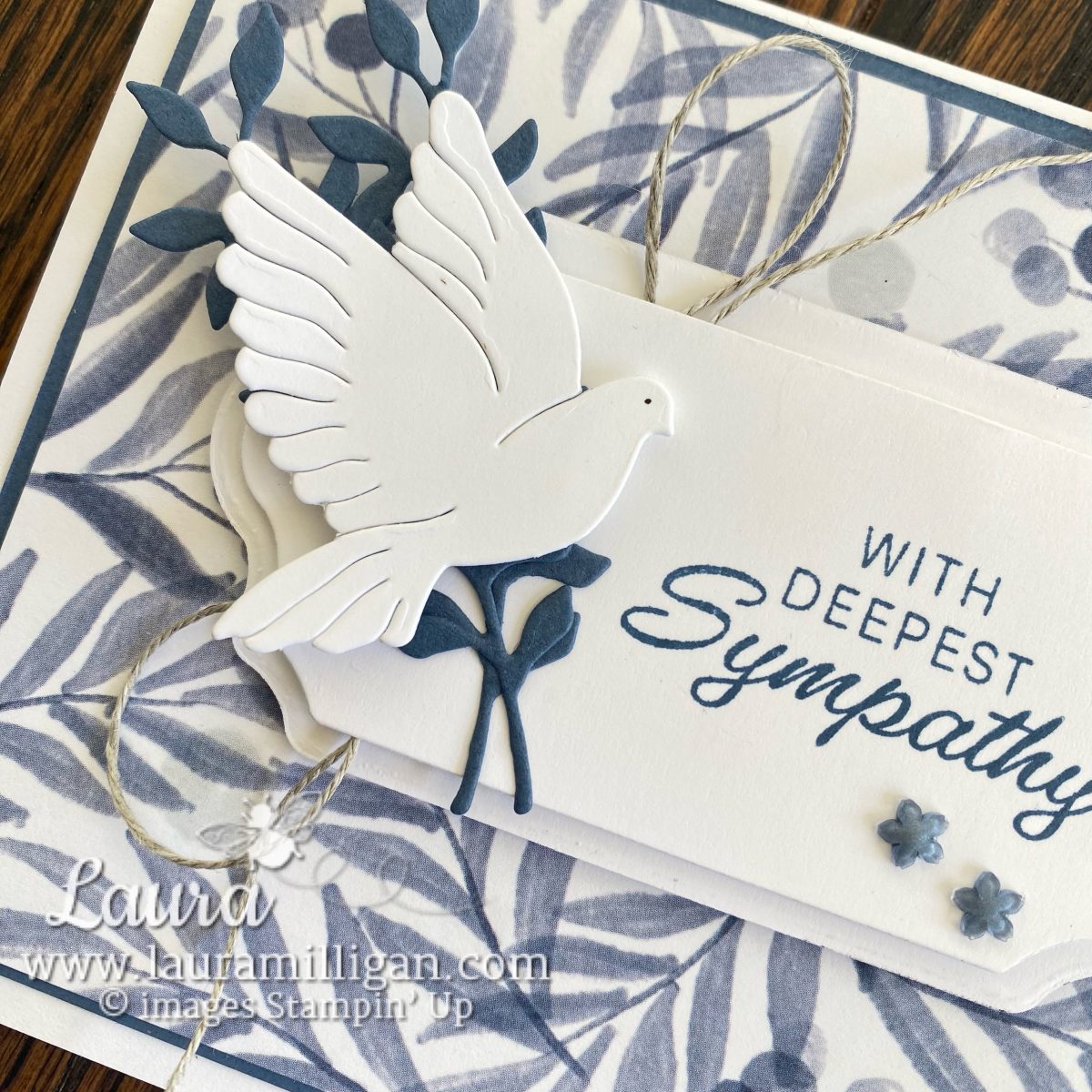 I love how the beautiful dove becomes the focal point of this card, paired with a subtle background of soft blue leaves. I used Misty Moonlight Ink and coordinating Designer Series Paper to create a serene, peaceful feeling – just what you want for a sympathy card. A few sprigs, some Linen Thread, and the Peace on Earth label dies bring everything together for a card that is simple yet so meaningful.