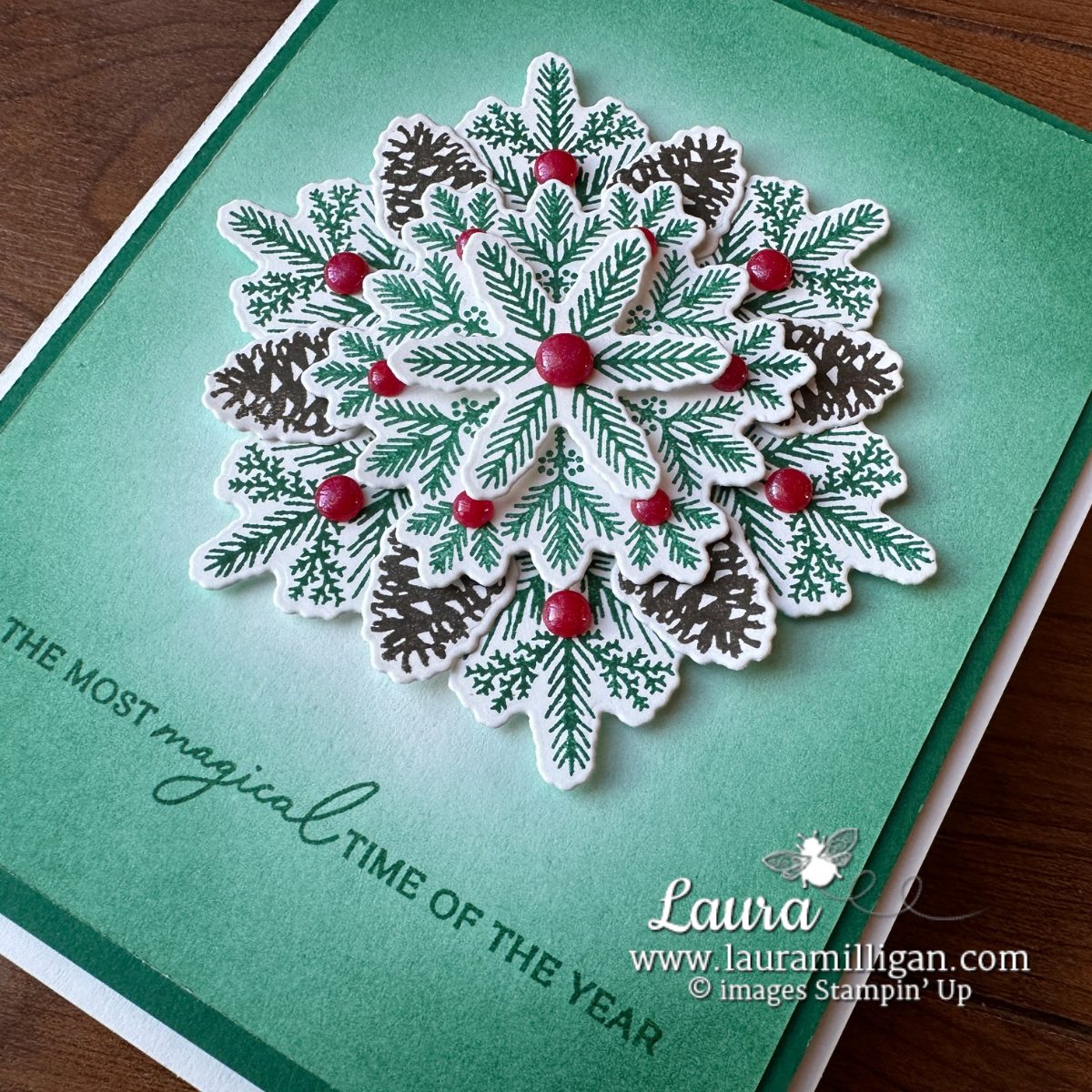 Today I’m sharing a soft and magical holiday card I created using the Delicate Pines Bundle from Stampin’ Up! I love how the snowflake shape of the pines define the card — and the pop of red berries adds just the right touch of festive charm. The blended background really lets the focal point shine!