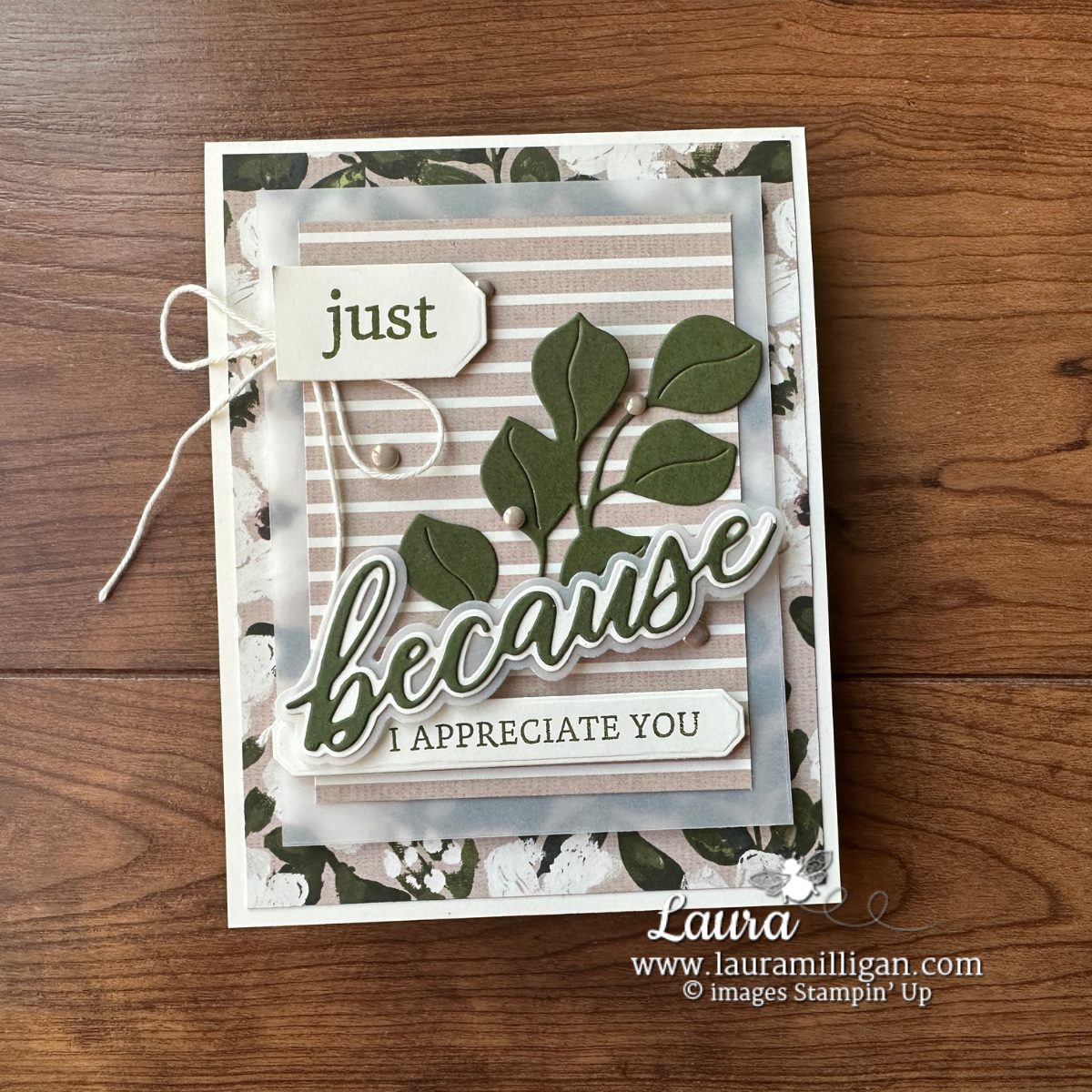The suite’s gorgeous florals and gentle textures do a lot of the heavy lifting here. I paired a striped panel with vellum for a bit of softness, then added leafy die-cuts for dimension. The large “because” sentiment is the real focal point—bold enough to stand out, yet still elegant thanks to the coordinating dies.
