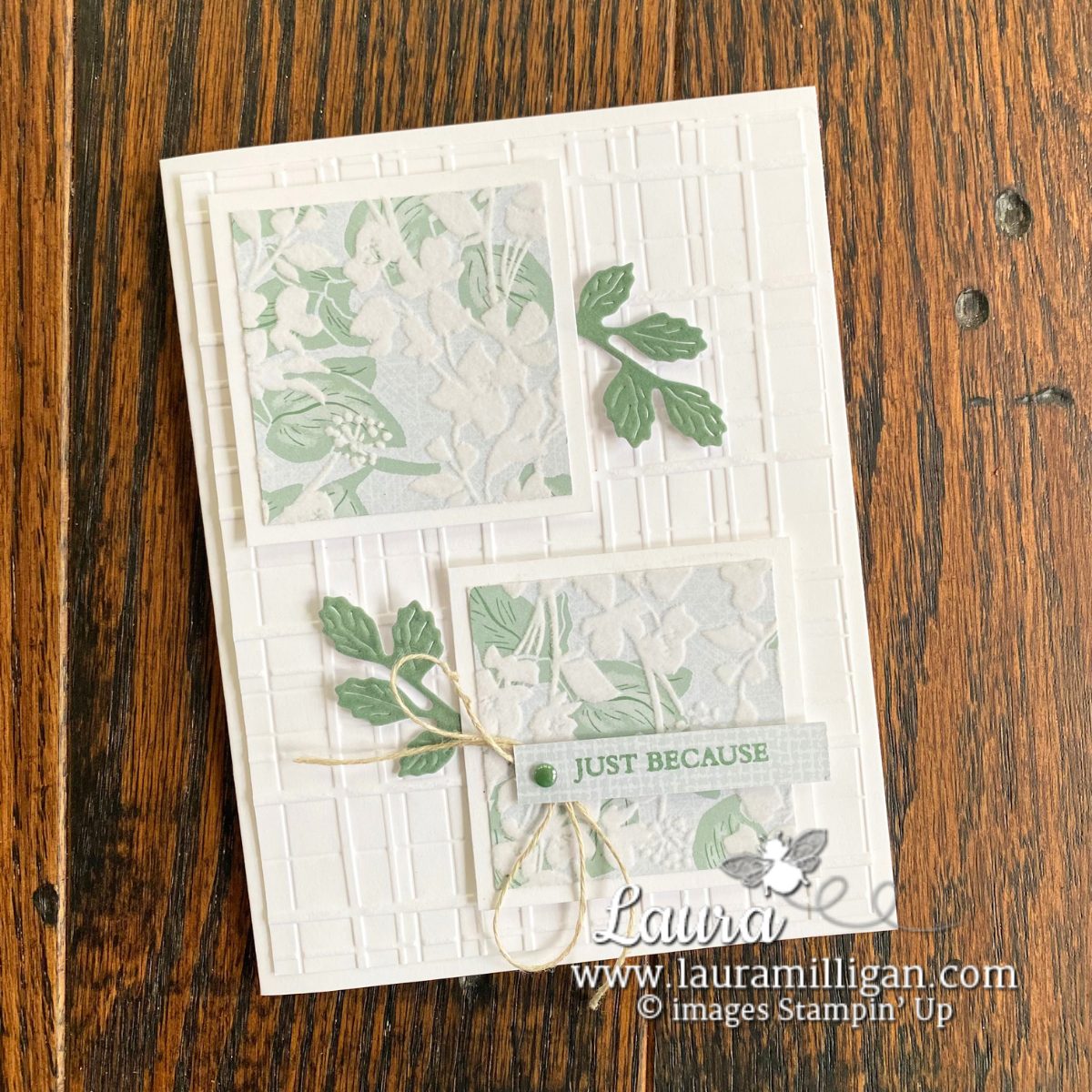 Let’s start with the card on the left. This design is all about soft layers and quiet texture. The embossed background creates a subtle grid that feels structured, while those vellum layers soften everything like a gentle breeze through wildflowers. Add in those leafy die cuts and a simple “just because” sentiment, and you’ve got a card that feels calm, thoughtful, and beautifully put together.