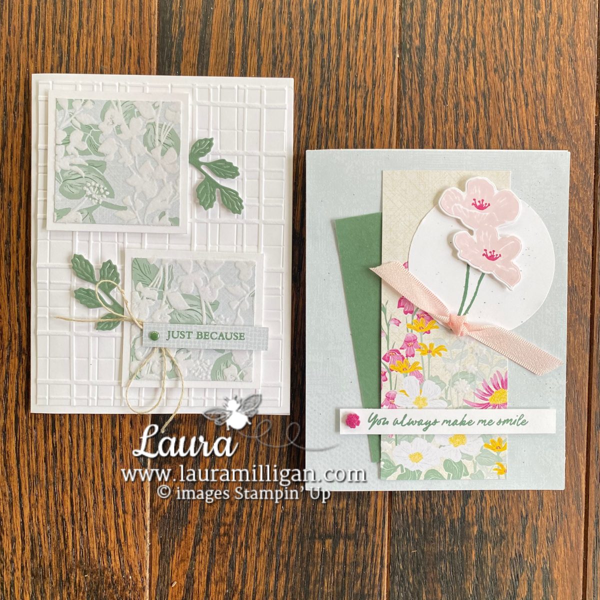 Now the card on the right takes a slightly brighter path. The floral Designer Series Paper brings in cheerful color, while the layered shapes give it that playful, stacked look we all love. The soft pink ribbon adds just the right finishing touch—like tying a bow on a bouquet.