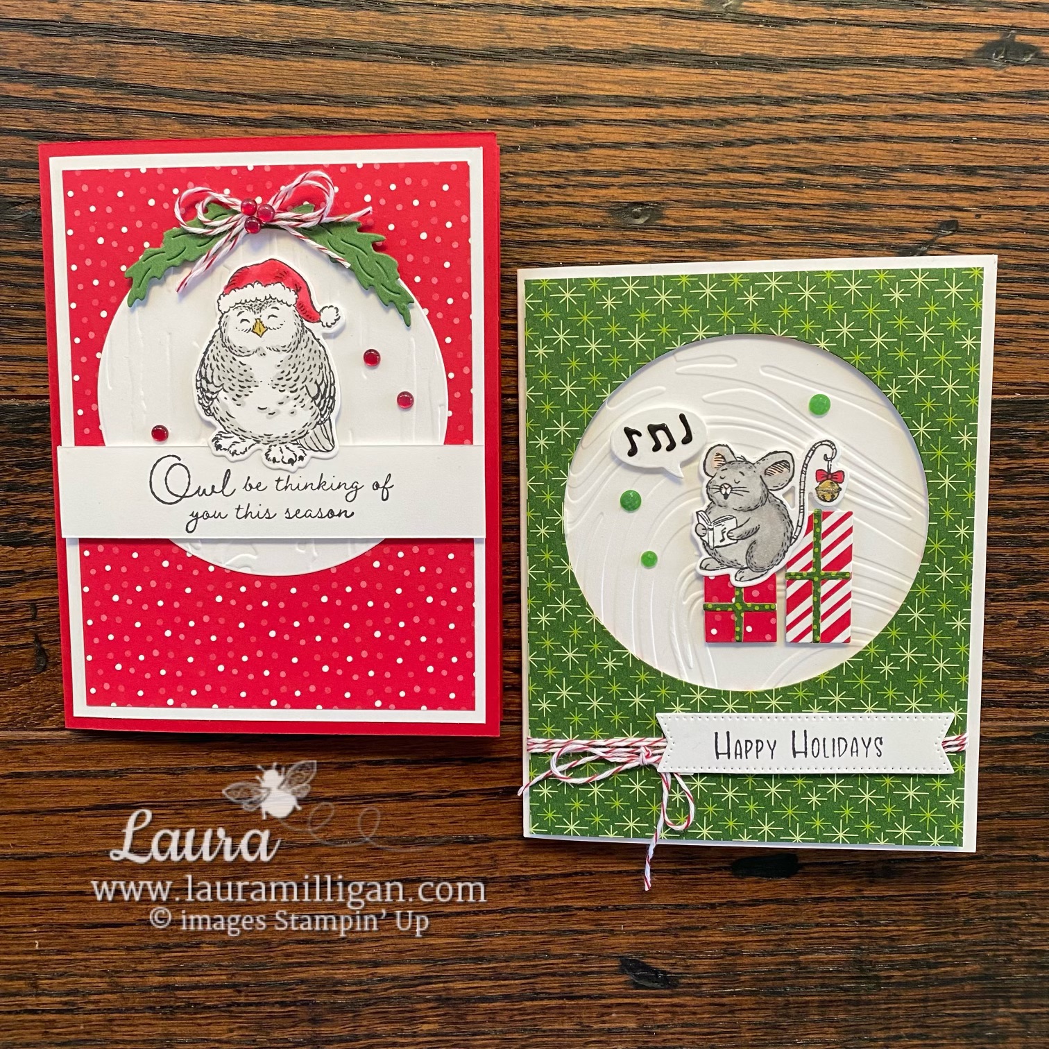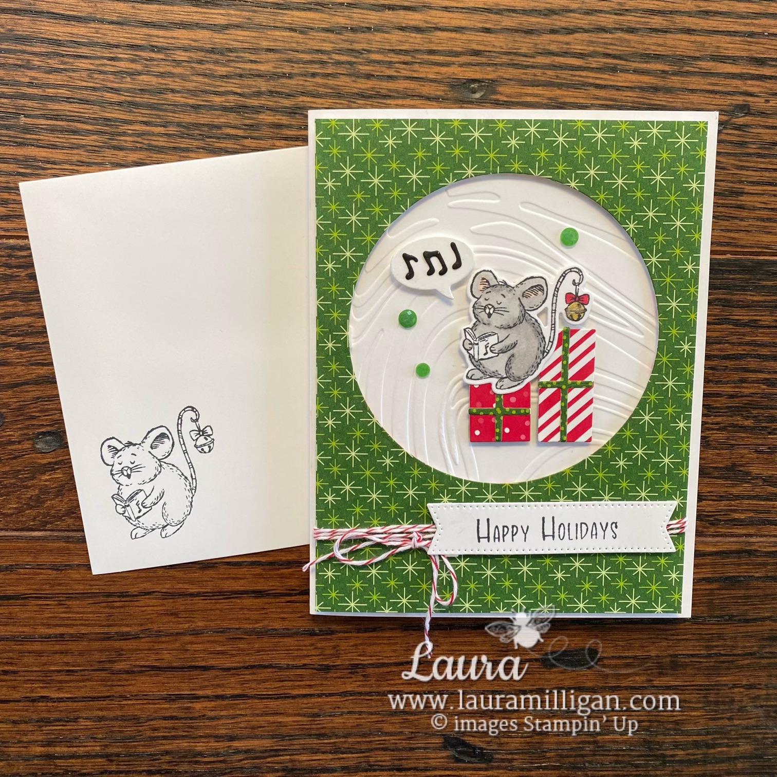 The first card used the second smallest circle die from the Stylish Shapes dies. The nice thing about cutting DSP with the dies is that you can do several at the same time – a great time saver! When I created this card, I asked my viewers to pick whether they liked the Santa in the center of the card – or if they preferred the house?? Which do you like best?