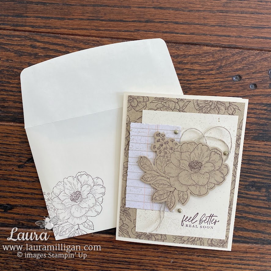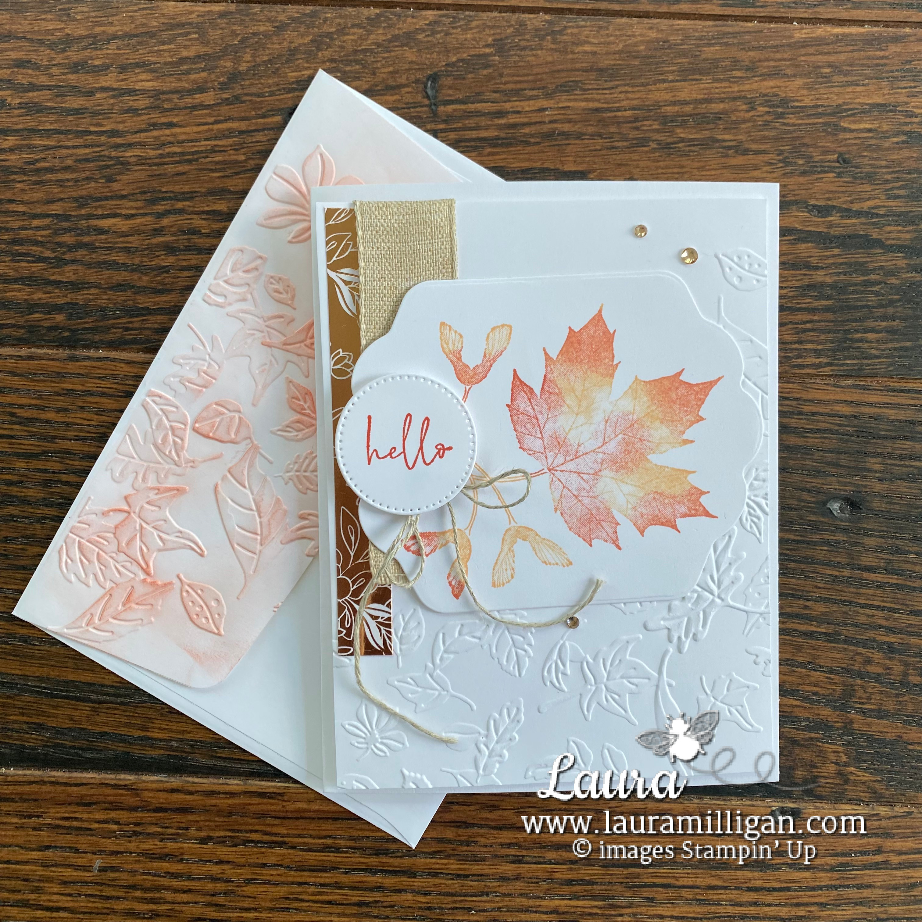Extra Touch: I embossed the envelope flap with the Leaf Fall Embossing Folder and then decided to use a Blending Brush and Calypso Coral ink to highlight the embossing. I like how it turned out and my viewers seemed to like it as well!