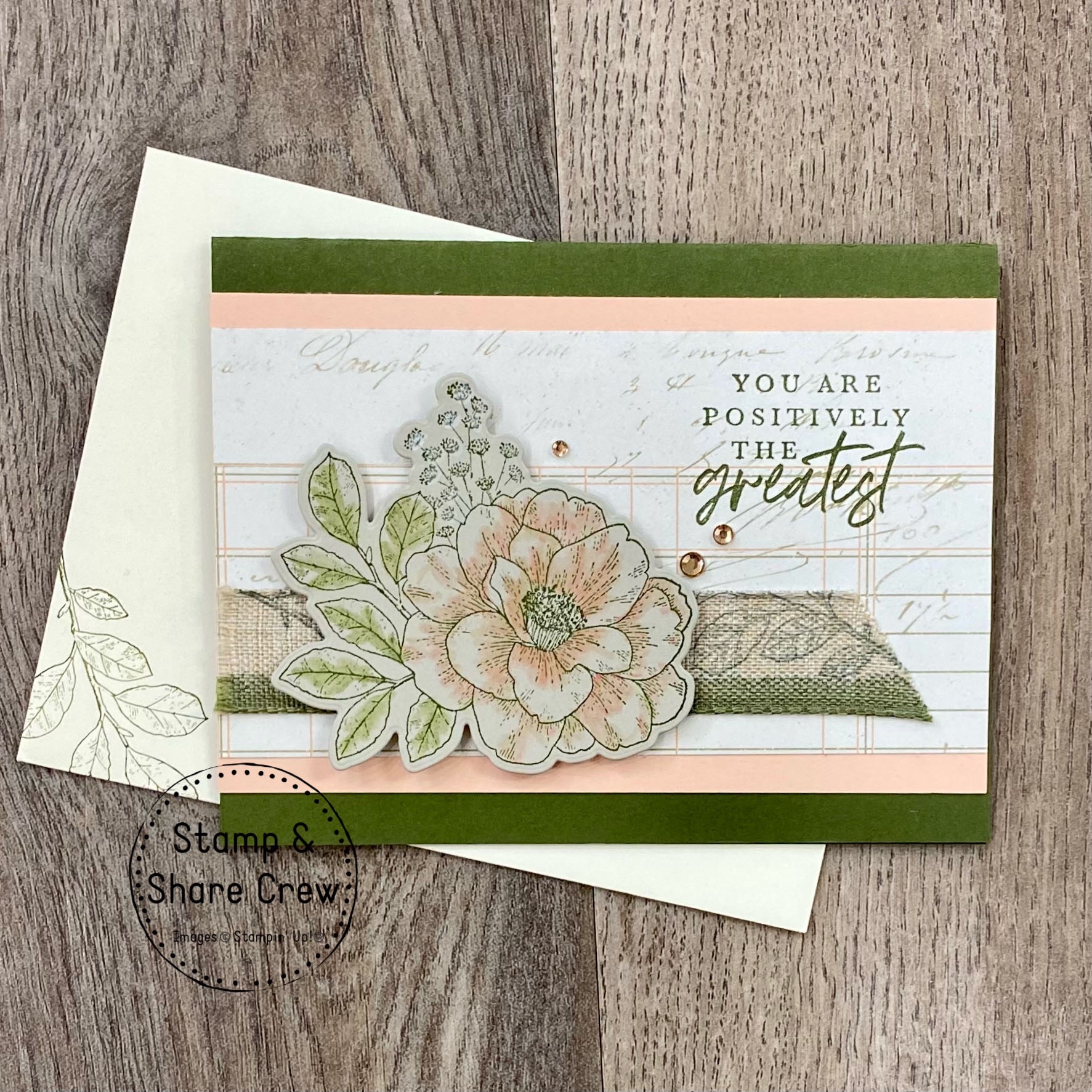 I also created a card featuring the Cottage Rose bundle. It was so fun to get back to doing a Live again! I missed it and was so happy to get to reconnect with my followers! The card features a neutral color palate – which I always like. The flower image was stamped with Early Espresso Ink onto Crumb Cake card stock and cropped with the Cottage Flower dies which are part of the Cottage Rose Bundle.