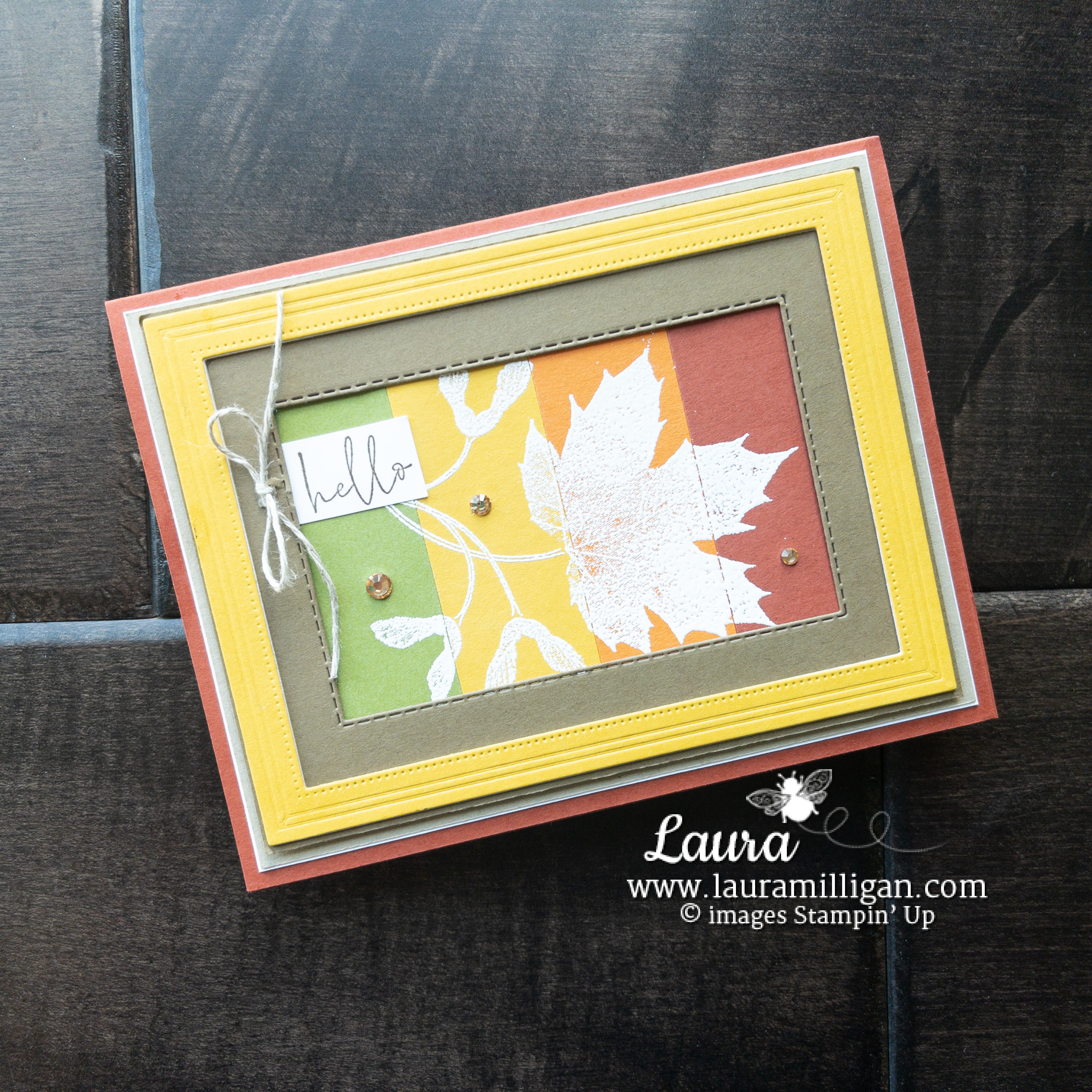 For my second card I inked up the leaf image with Pale Papaya ink. Then I used a Sponge Dauber with Calypso Coral ink and added some ink onto the leaf for some contrast in color. (You can see me do this in the facebook live video). This is fun to do and for the leaves you could switch up the inks for a multitude of colors! Each leaf will turn out a little different – just like in nature.
