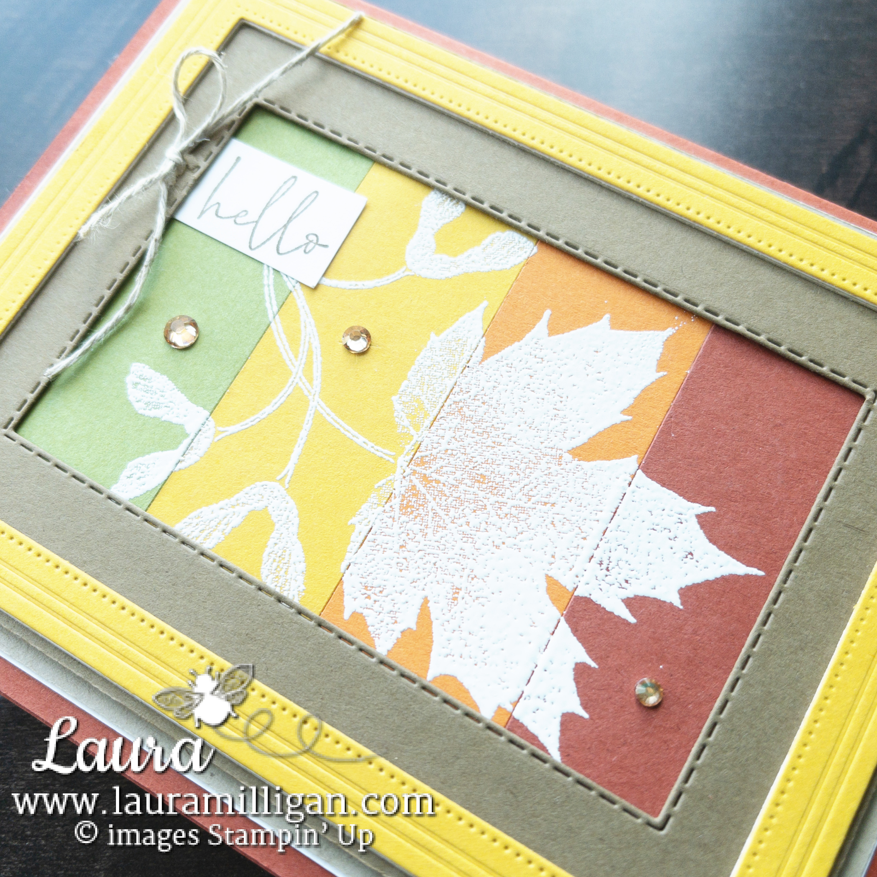 Again, I started with a Thick Basic White card base and then embossed a panel of Basic White with the Leaf Fall embossing folder. I added a strip of Splendid Day Specialty Paper along the left edge, as well as a piece of the 7/8″ Natural Finish Ribbon.