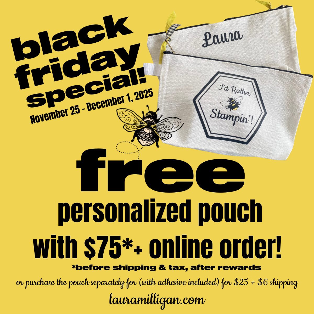 Each pouch is customized with your name and features my exclusive “I’d Rather Be Stampin’” bee design. It’s adorable, practical, and perfect for keeping your favorite crafting tools close at hand. You’re going to love it! (no adhesive included).