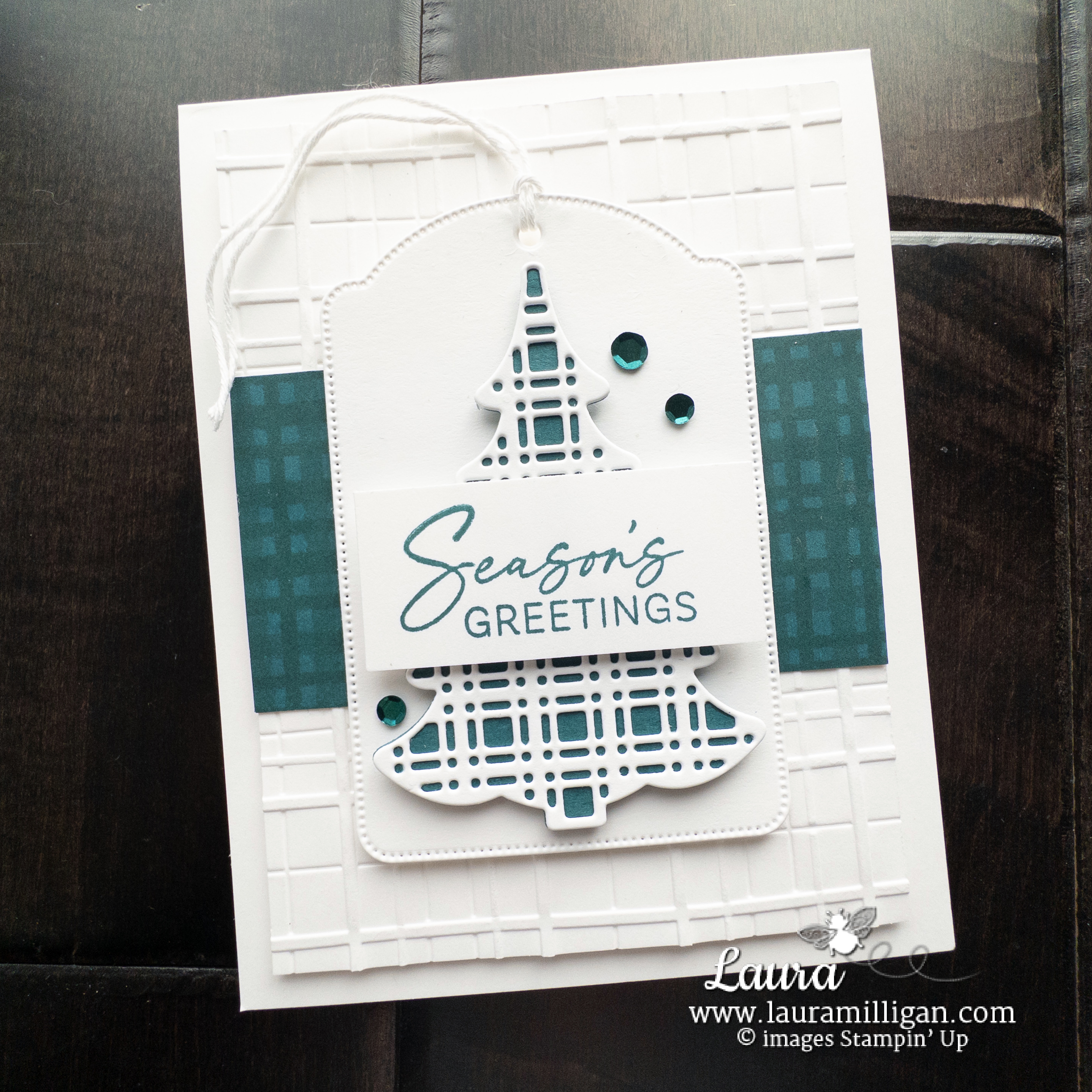 - Use a Stampin’ Cut & Emboss Machine (Standard or Mini) to crop the tag (Greetings of the Season Dies), solid tree and plaid tree (Decorative Tree Dies).