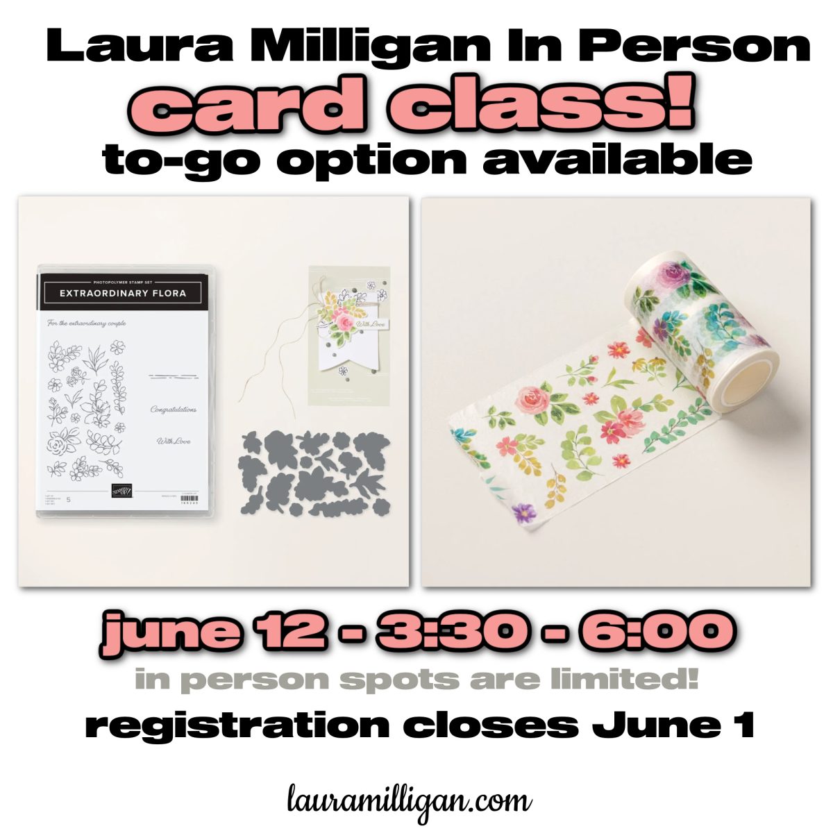 If you tuned in to my recent Facebook Live, you saw two beautiful cards I created using the Extraordinary Flora Bundle and the stunning coordinating Washi Tape. The response was amazing — so many of you loved the projects and have been asking for an IN PERSON class. Well, I heard you loud and clear… and I’m so excited to announce a brand new In Person Card Class (with a to-go option, of course)!