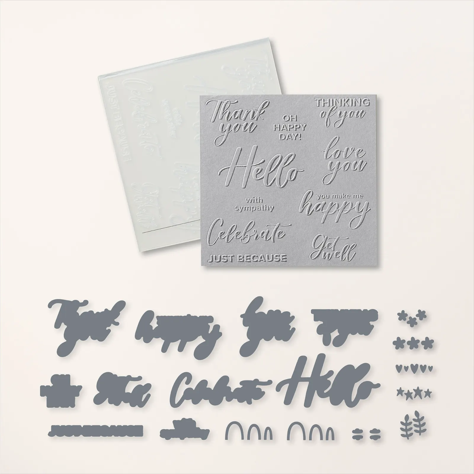 And here’s a look at the Thoughtful Expressions Hybrid Embossing Folder. These hybrid embossing folders are quite amazing! I used my brayer with Basic Gray ink to add a fine outline to the words before I ran it through my Stampin’ Cut and Emboss Machine.