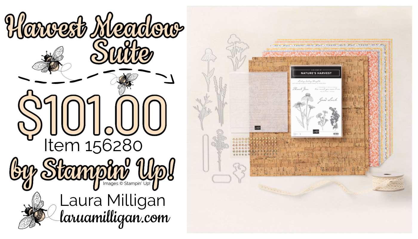 I am doing a Facebook Live every day this week to kick off the new July- December Mini Catalog and Saleabration! The card above is created with products from one of my favorite new suites – The Harvest Meadow Suite. This suite consists of a beautiful stamp set with dies, gorgeous Designer Series Paper, new ribbon and even cork paper! This suite is a must have for year round beautiful stamping!