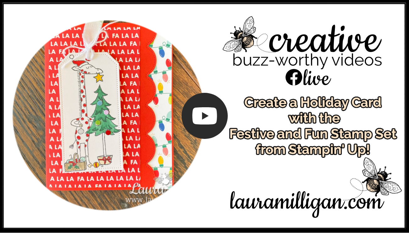 I made a cute card on my Facebook Live this week featuring the Festive & Fun stamp set! I love the bright and cheery colors – and this stamp set is true to its name – Festive & Fun! I used the So Scalloped Contour Dies to create a scalloped edge on the front of the card. The Merry Bold & Bright is a perfect DSP to compliment this fun stamp set!