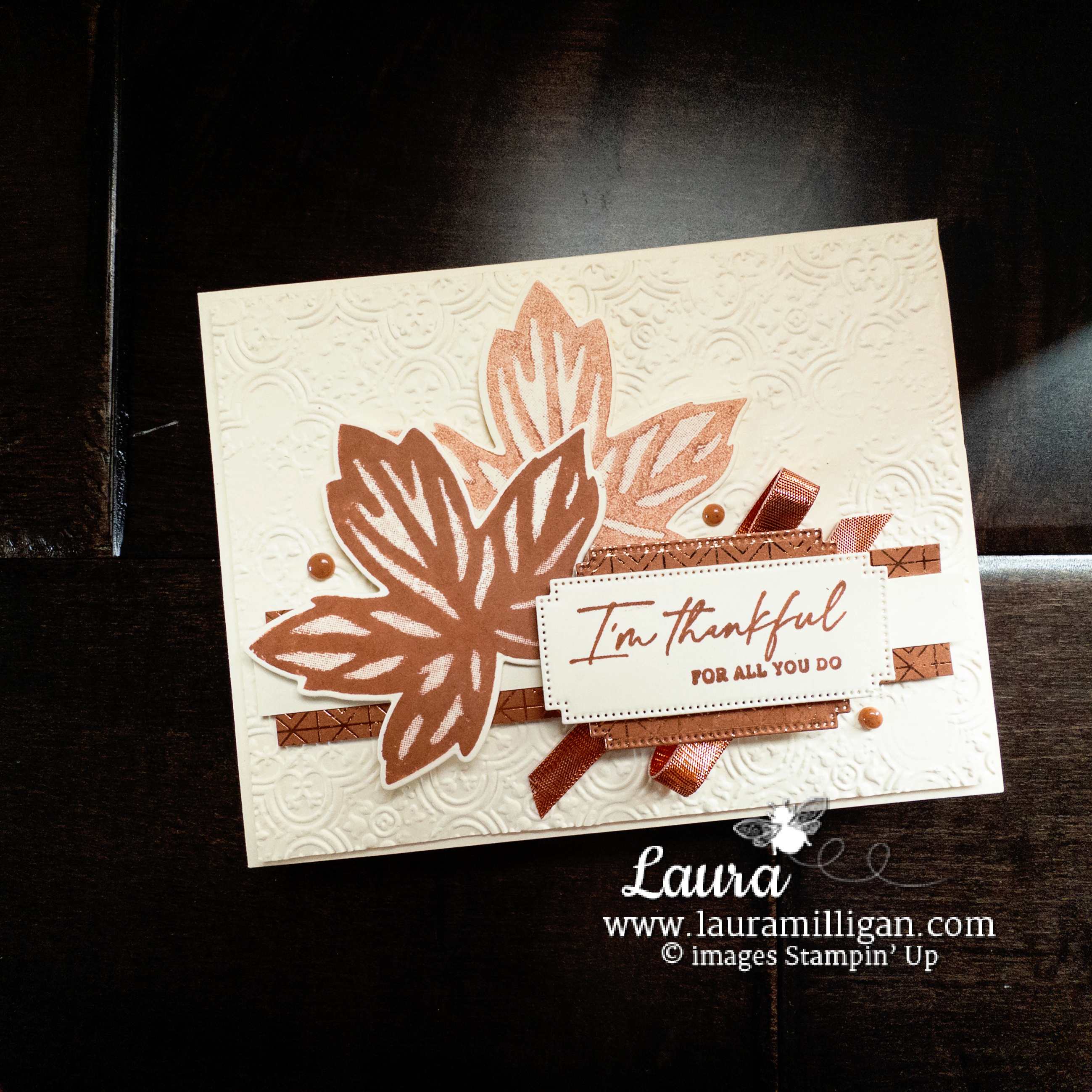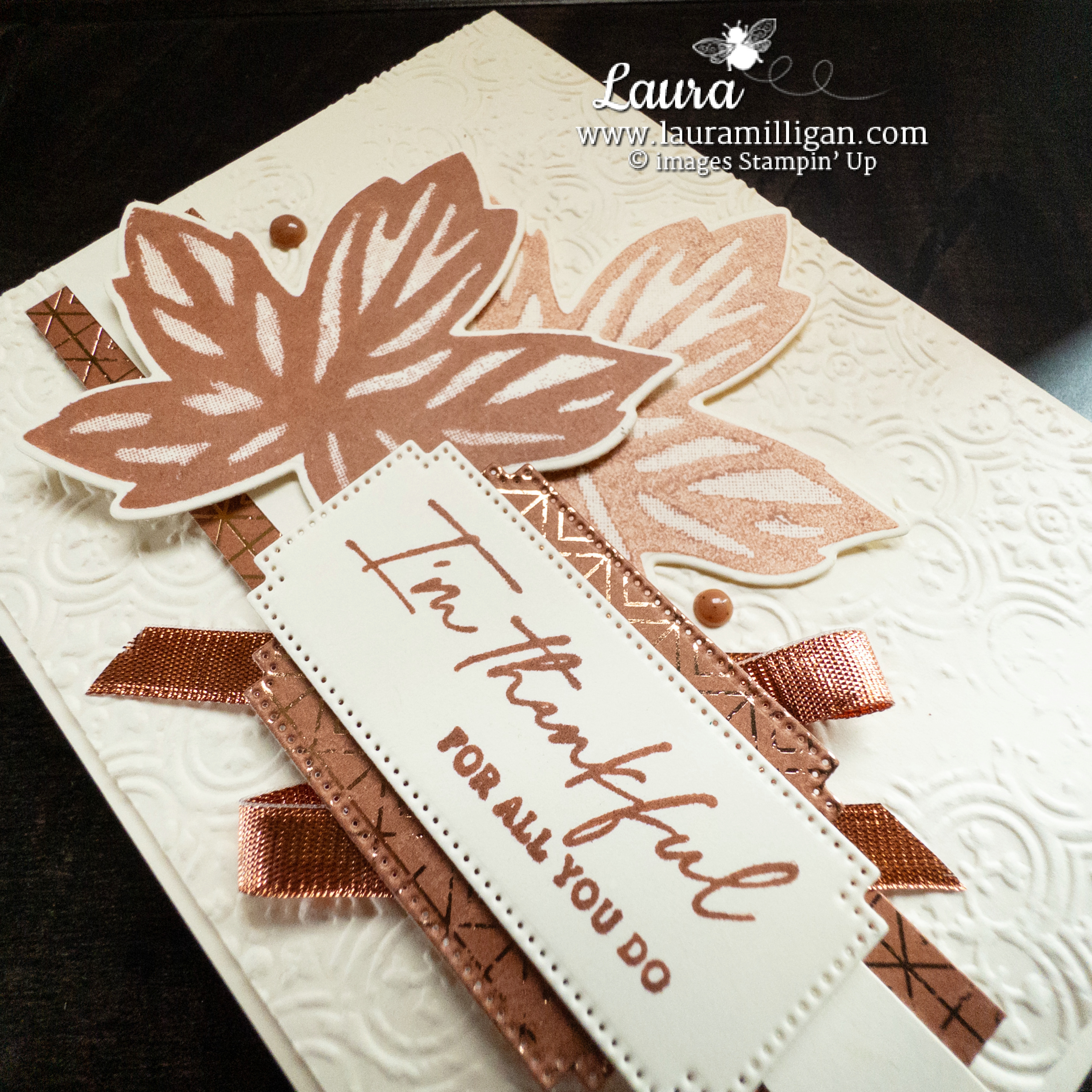 - Very Vanilla – 5 1/4 x 4 (embossed layer), 5 x 1/4 (strip), 2 3/8 x 1 (die-cut sentiment), 6 x 3 1/2 (stamped/die-cut leaves)