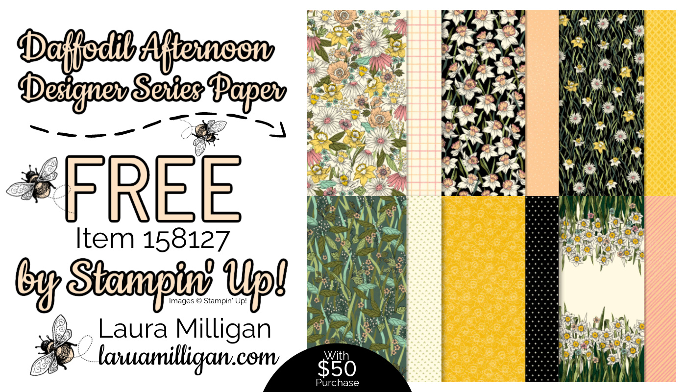 Today’s free tutorial is a beautiful “fun fold: card featuring the Daffodil Daydream Bundle. This just screams of spring to me! We’ve had quite the blast of winter where I live and these daffodils are a refreshing change! The Designer Series Paper- Daffodil Afternoon is a free product offering during Saleabration! It’s free with a $50 product order – and it’s sooooooo pretty!