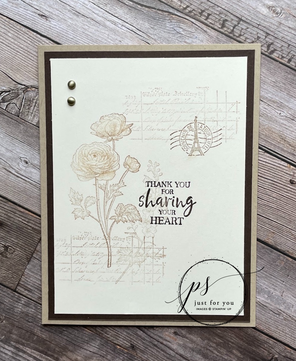 Today’s free tutorial is all about simplicity and I love this card. Collages always appeal to me and this set of neutral tones has a soft, yet earthy feel. The Ranunculus Romance Stamp Set is great on it’s own (simplistic) but if you want to step it up, buy the bundle and save 10% (over purchasing the stamp set and dies individually).