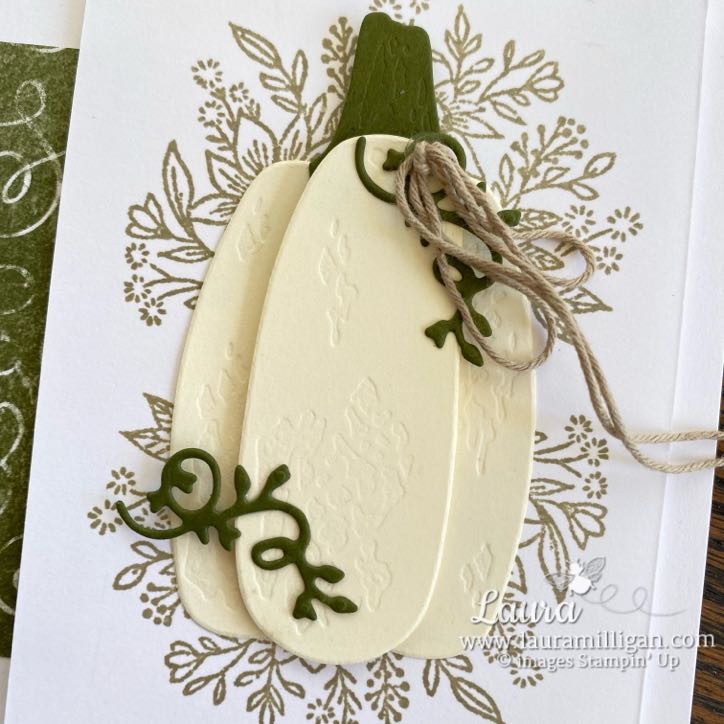 This is a great bundle – and even has some beautiful Designer Series Paper that coordinates – I used just a snippet in my card. I love that the dies for the pumpkin create some added texture when they go through the Stampin’ Cut & Emboss Machine! You can see that added detail in my card but also in the photo below –