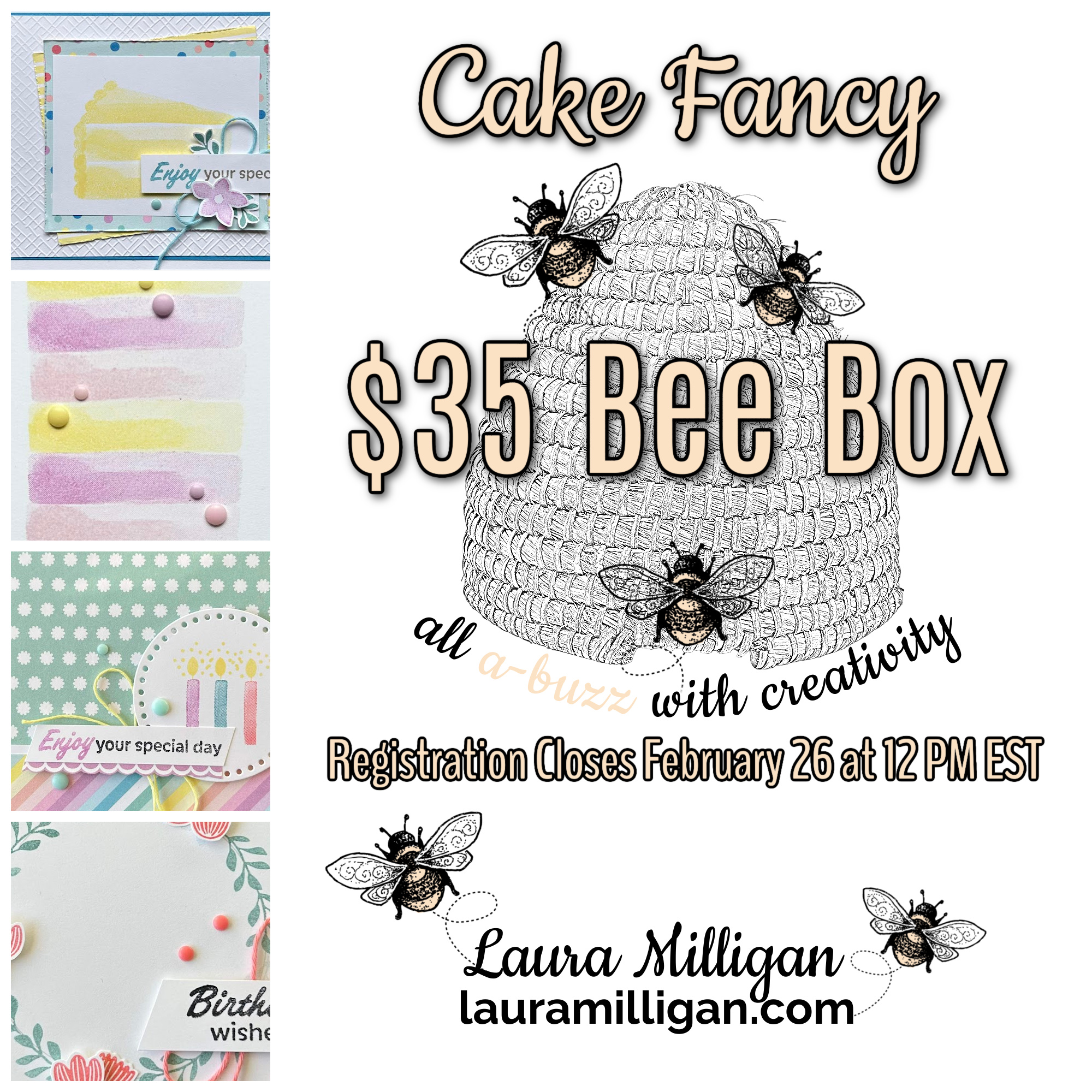 Want some pretty, feminine soft and beautiful birthday cards? The Cake Fancy stamp set will help you create these and more!!! I love this Cake Fancy set – and my Bee Box for February features four different cards – you ‘ll be proud to send – and you will make two of each for a total of 8 birthday cards.